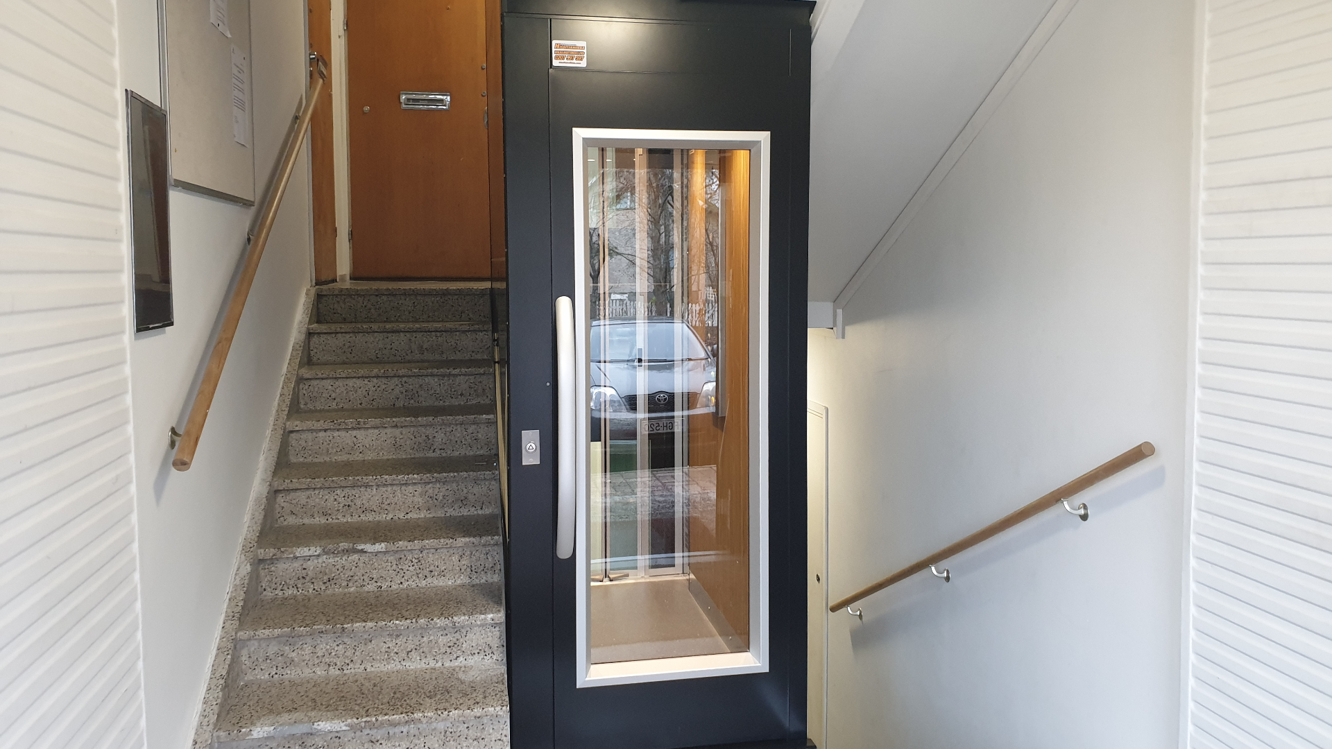 Hissittömään kerrostaloon portaan keskelle toteutettu kapea Amslift jälkiasennushissi.