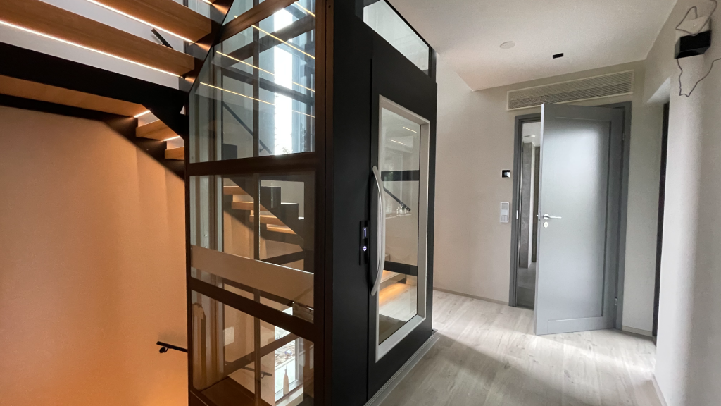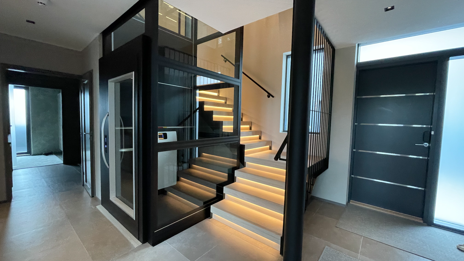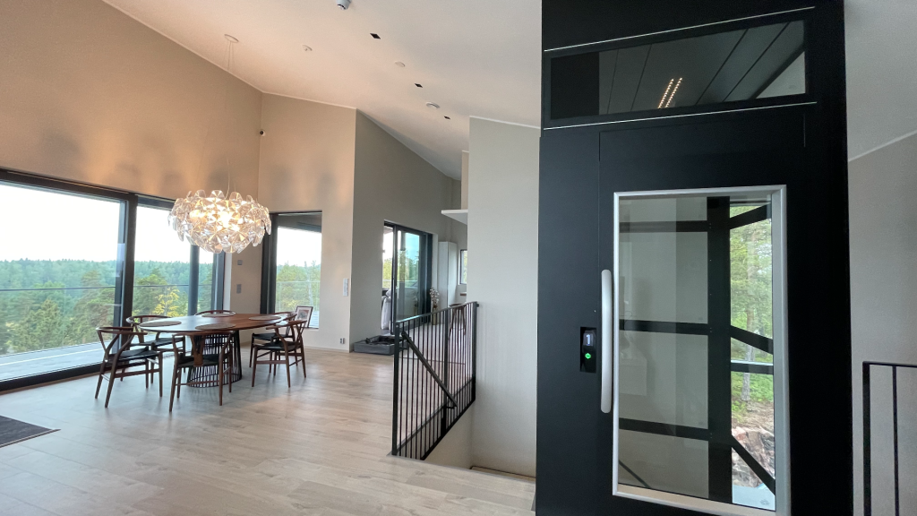 Kotihissitrendin aallon harjalla tähänkin uuteen omakotitaloon asennettiin jo heti rakennusvaiheessa Cibes Air kotihissi helpottamaan elämää esimerkiksi ostoskassien kuljettamisessa kolmannessa kerroksessa sijaitsevaan keittiöön. Myös perheen koira nauttii hissin kyydistä mieluummin kuin kulkee portaita pitkin. Tyylikäs lasikuilu yhdessä mustan sävyn kanssa istuu sisustukseen kuin nenä päähän ja tuo arvokkuutta kodin keskellä sijaitsevaan porraskuiluun. Referenssivideo: https://youtu.be/GKsMfeqchy0?si=GG71RdUV-JUSJmHz