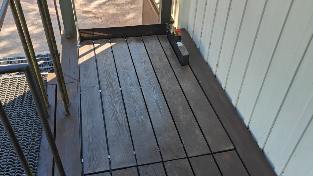 Joskus olemassa olevissa suojelluissa rakennuksissa on haasteellista saada esteettömyyttä parannettua, jotta kaikki halukkaat vierailijat pääsisivät nauttimaan kulttuurista yhdenvertaisesti. Pitkän alan kokemuksemme sekä laajan tuotevalikoimamme avulla saimme tähänkin kohteeseen tiiviissä yhteistyössä arkkitehdin kanssa suunniteltua ratkaisun, joka saatiin integroitua rakennuksen arkkitehtuuriin, mutta jonka avulla myös apuvälineiden kanssa kulkevat asiakkaat saadaan esteettömästi tiloihin. Normaalisti uudessa kohteessa tällaisessa nostimessa olisi ylä- ja alatasolla portit suojaamassa putoamisvaaralta, mutta tässä kohteessa riskinarvion kautta huomioiden kohteen suojelumääräykset sekä valvotun käytön, toteutimme ns. flatbed version saadaksemme hissin naamioitua terassirakenteisiin.