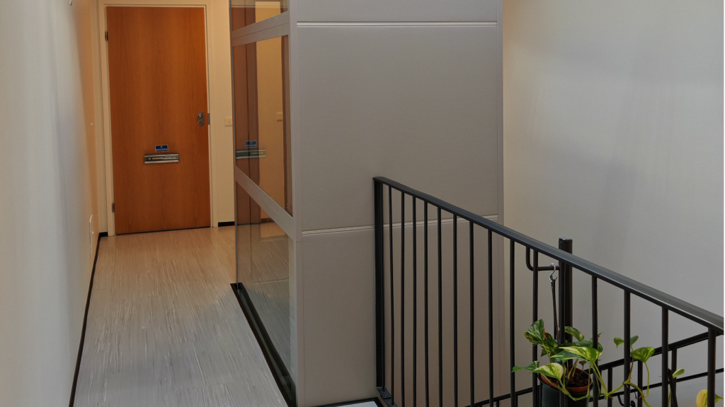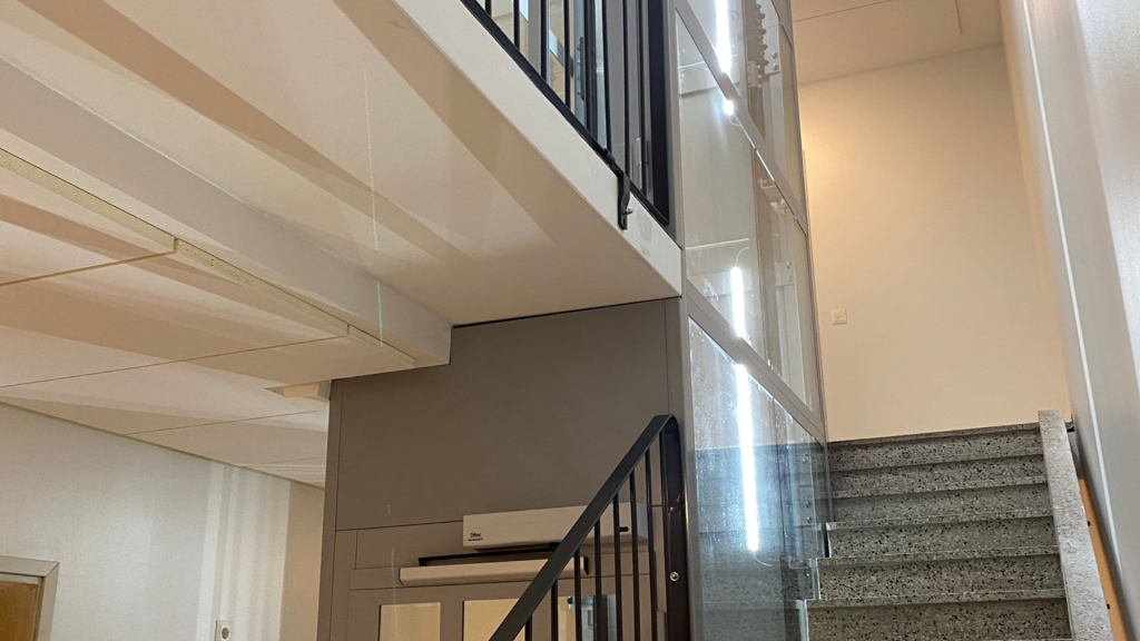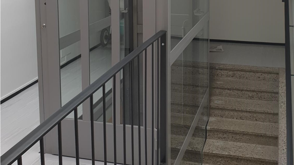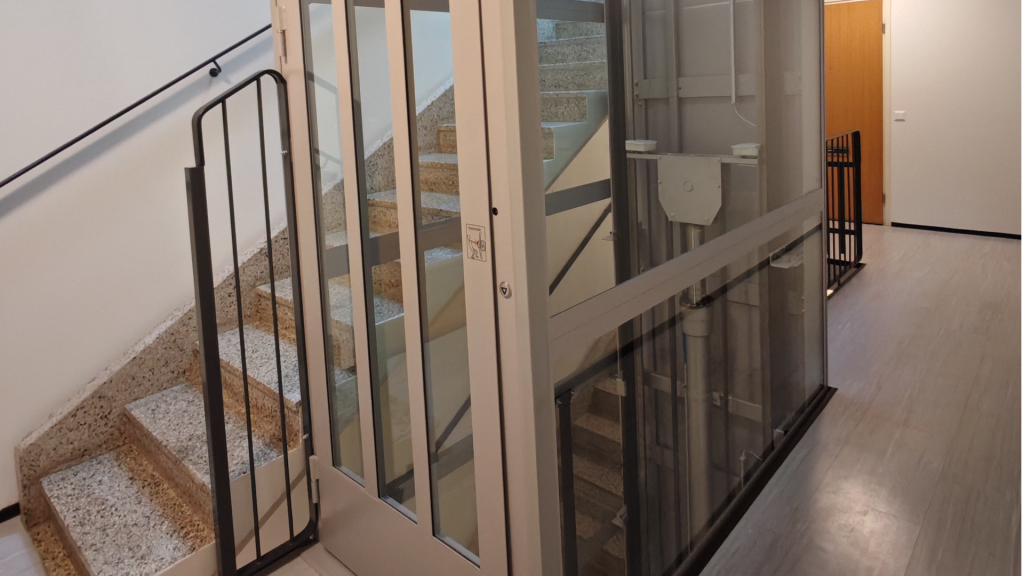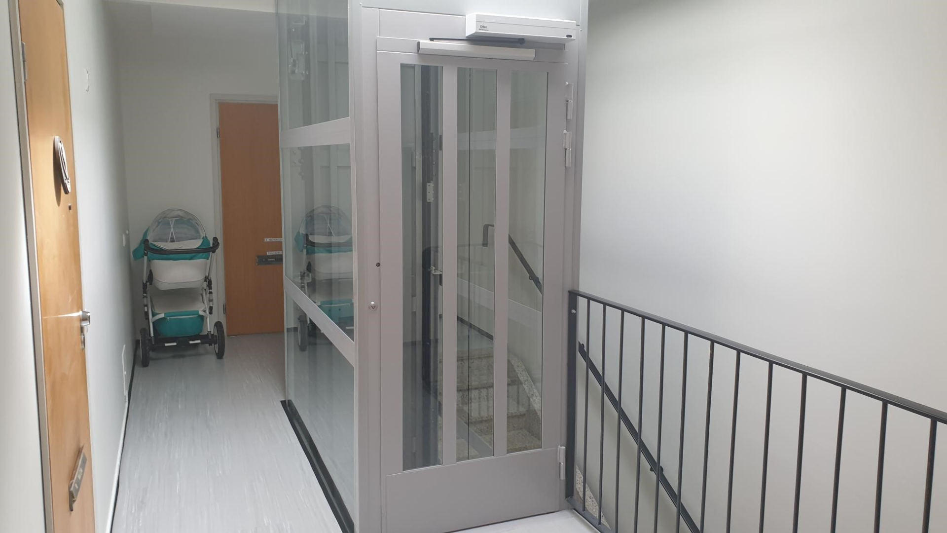 1970-luvulla rakennettuun hissittömään kerrostaloon toteutettiin kapea Amslift jälkiasennushissi portaan vierelle.