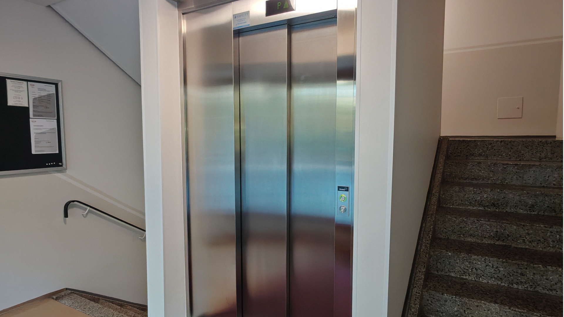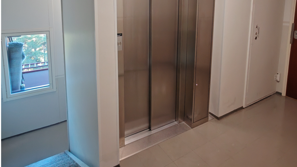 1970-luvun kerrostalon vanhan hissin päivitys tuli ajankohtaiseksi, jolloin siihen lisättiin myös maan tasoon uusi sisäänkäynti esteettömyyden parantamiseksi.