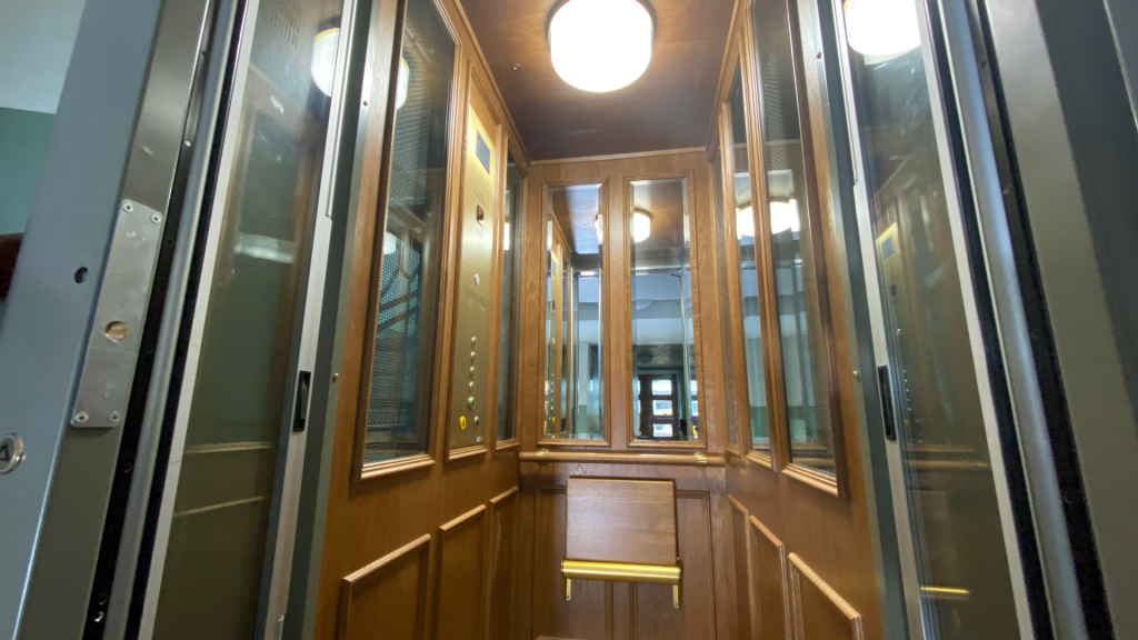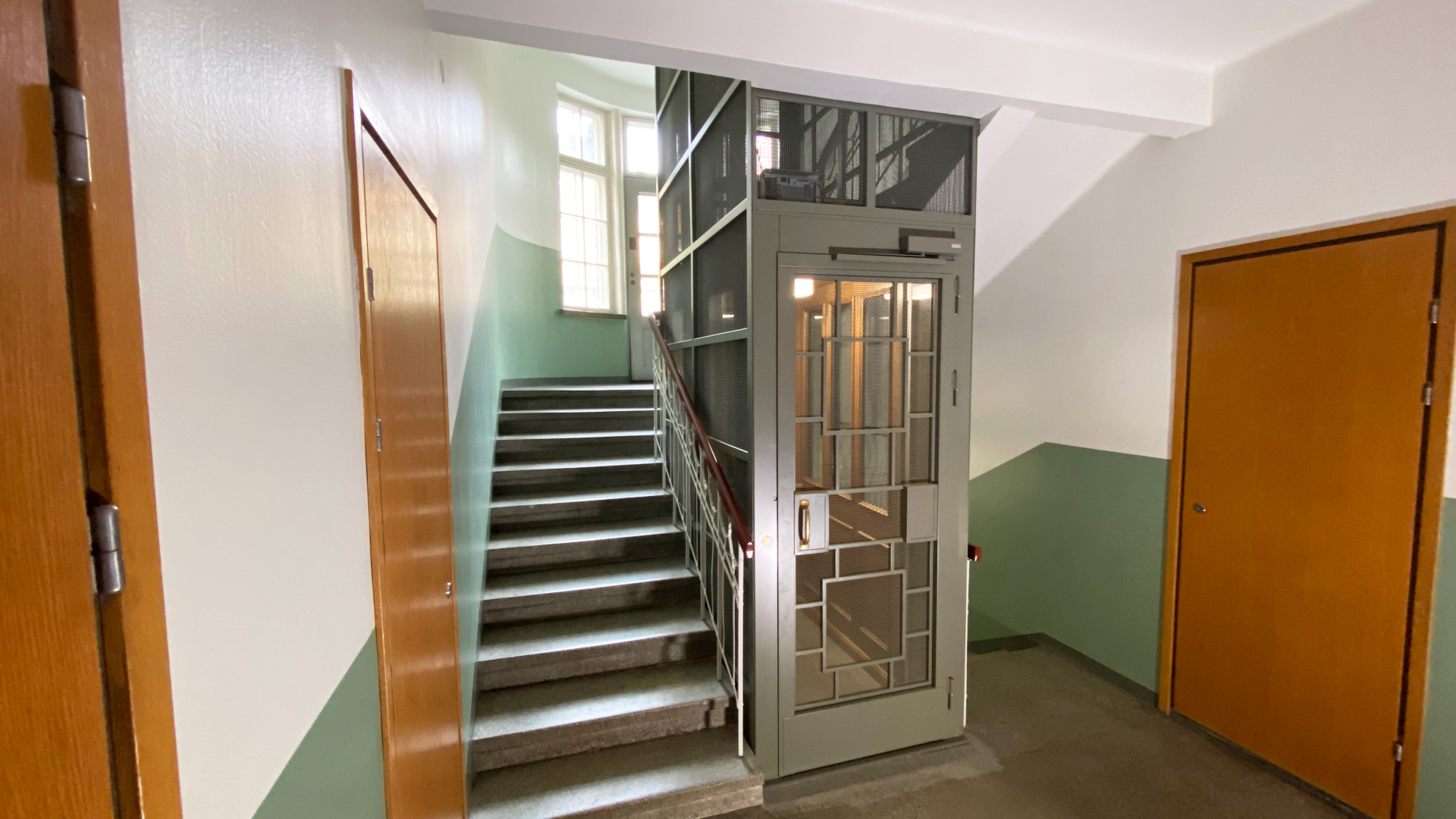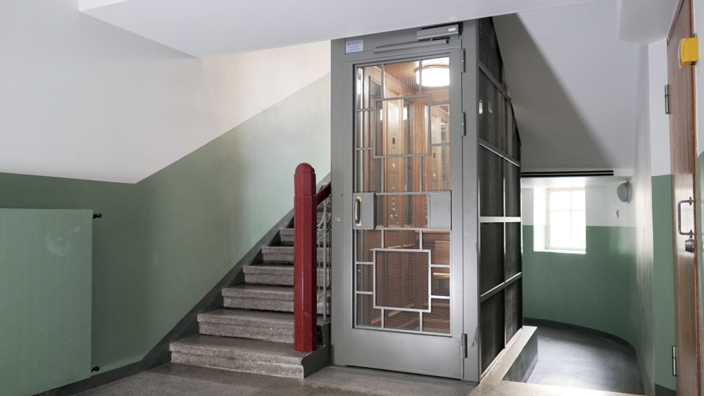 Vanhaan arvokiinteistöön asennettiin jälkiasennuksena hissit, jotka räätälöitiin porraskäytävän ilmeeseen sopiviksi vanhan portaan keskelle.