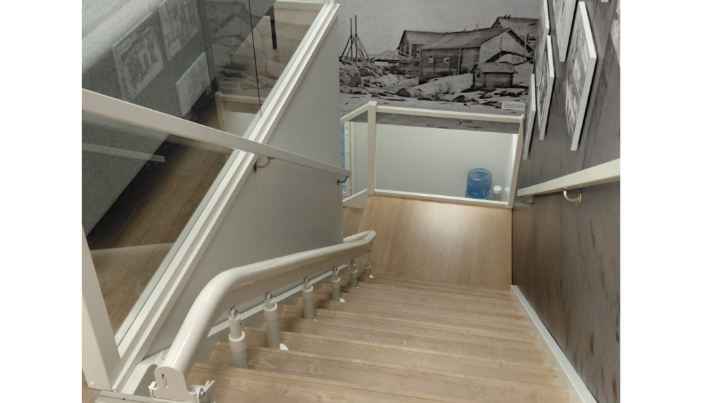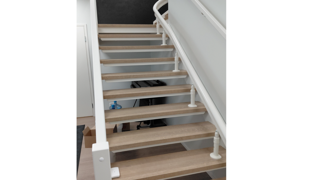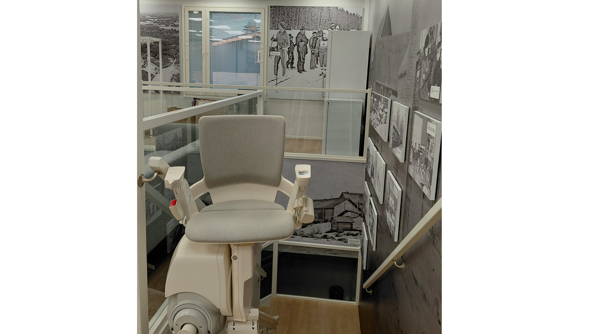 Otolift Modul-Air Smart mahdollistaa toimiston yläkertaan pääsyn sellaisille henkilöille, joilla on haasteita liikkua portaissa. Tuolihissi sopii sävytykseltään mukavasti ympäristöönsä ja saadaan taitettua näppärästi säilytysasentoonsa, kun tuolihissiä ei käytetä.