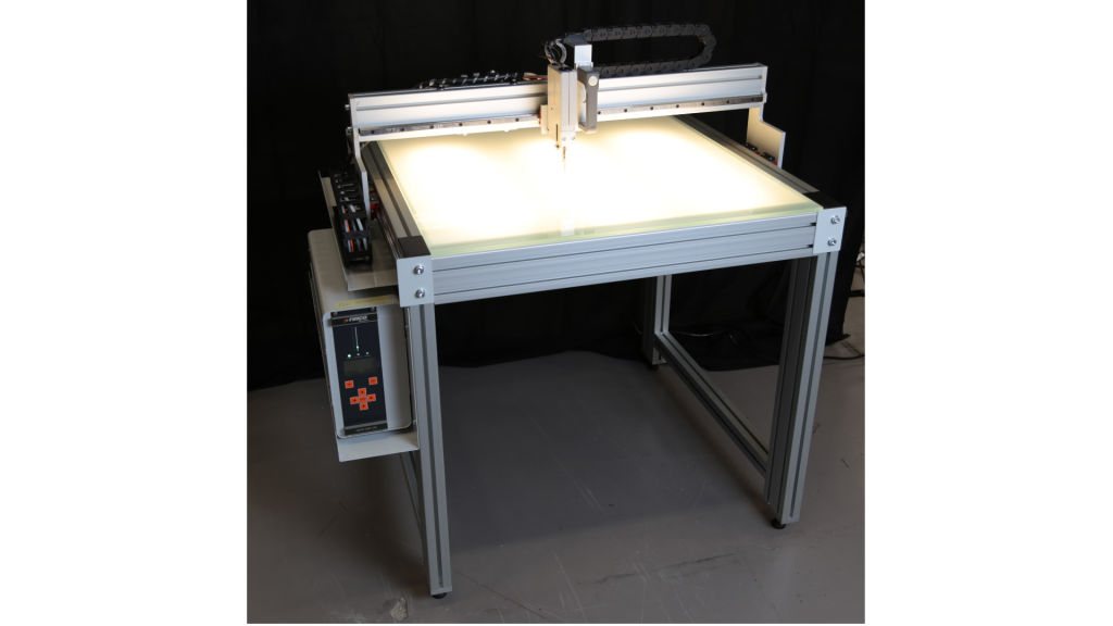 Käsikäyttöinen ultraäänihitsauspöytä ohuiden muoviarkkien yhteen liittämiseen. Hitsaustaso toimii myös valopöytänä visuaalista laaduntarkastusta varten