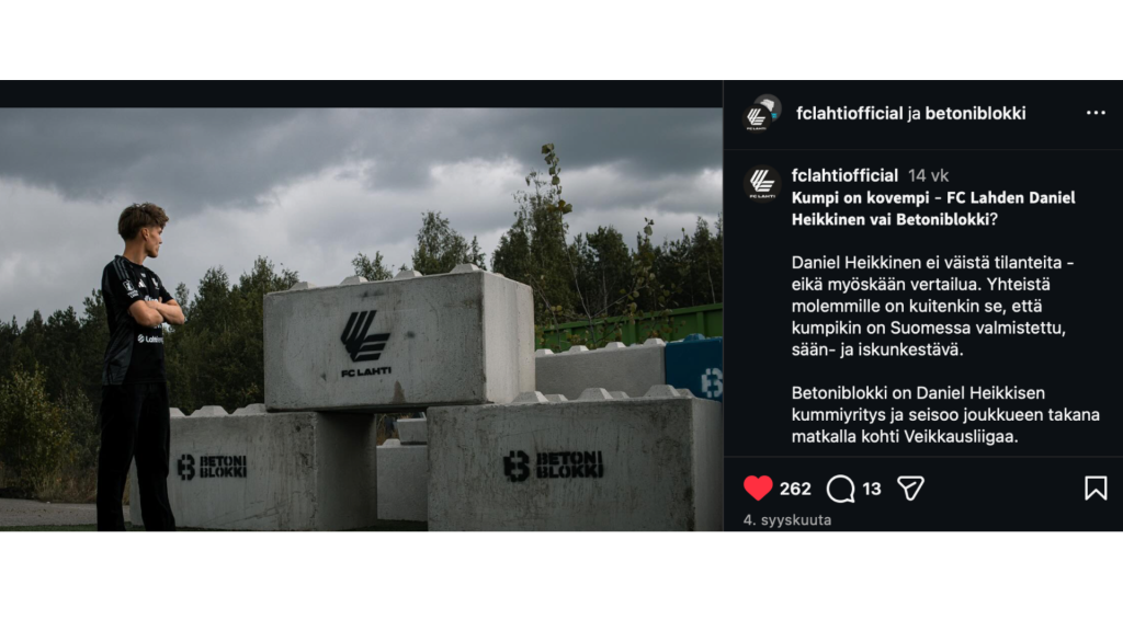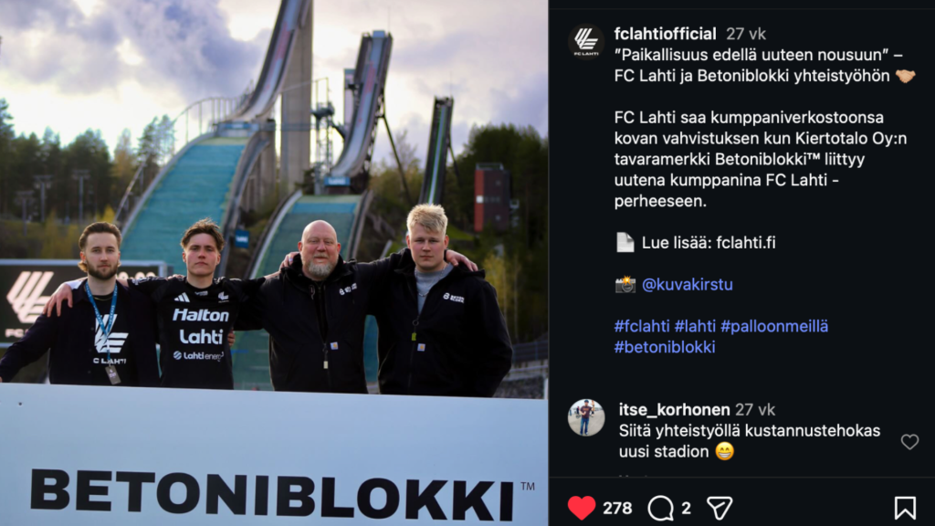 Me FC Lahdessa haluamme rakentaa kumppanuuksia, jotka tuottavat aitoa arvoa molemmille osapuolille. Näkyvyyttä, yhteisöllisyyttä, paikallista vaikuttavuutta ja paljon muuta. Yhteistyön keskiössä oli selkeä tavoite: vahva paikallinen näkyvyys ja brändin esiin tuominen. Betoniblokki toi FC Lahti -yhteisöön vastuullisuutta ja paikallista voimaa – juuri niitä arvoja, joita FC Lahti haluaa omassa toiminnassaan vahvistaa. – Näin FC Lahden tulevassa kaudessa selkeän yhteyden kiertotalouteen: mennään vanhoihin asioihin uusilla mielin ja tehdään ne toisin. Niin meillä kuin myös FC Lahdellakin, on tilaisuus tuoda nuorta voimaa esiin, totesi Kimmo Laaksonen ennen kauden alkua. Betoniblokki kannustaa myös muita paikallisia toimijoita mukaan FC Lahden kumppaniverkostoon. Laaksosen viesti on selkeä: – Paikallisten yritysten tulisi tukea paikallista urheilua. Sen kautta yhteisöllisyys ja usko yhteisiin asioihin vahvistuvat.