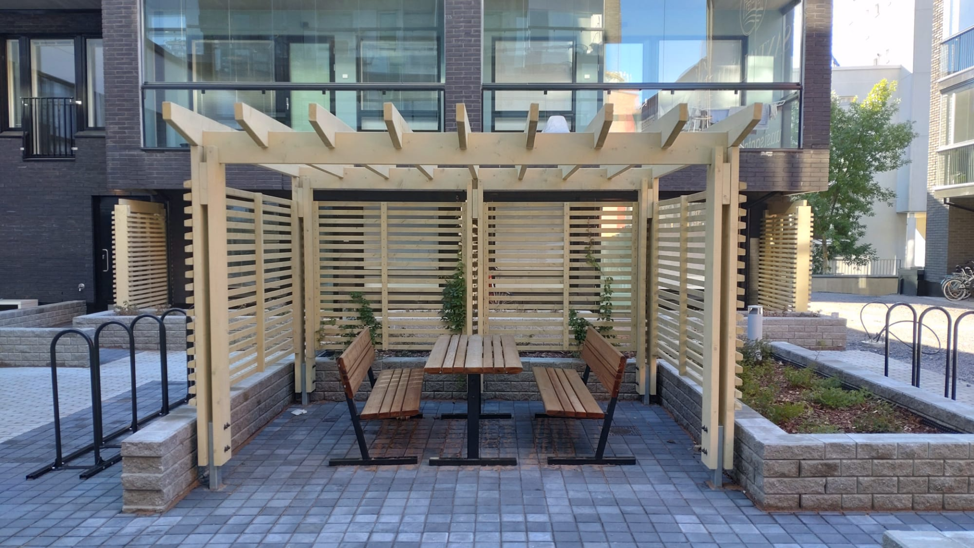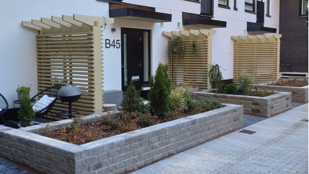 Yhdistimme tuotteet ja räätälöidyt ratkaisut projektissa, joka sisälsi vakiotuotteiden lisäksi asiakkaan toiveiden mukaiset pergolat ja köynnöstuet. Asiakas oli tyytyväinen työn laatuun ja palveluun.