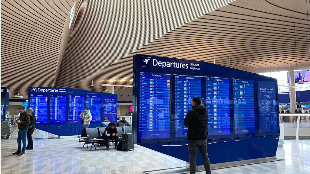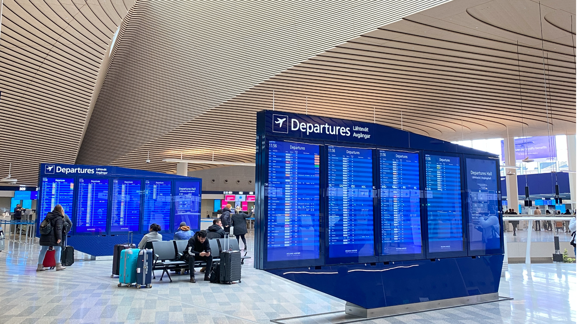 Uudistuneen Helsingin lentokentän lähtöaulaan tarvittiin isot näytöt palvelemaan suurta määrää matkustajia kerralla. Fite vastasi haasteeseen isoilla ja kirkkailla pro-sarjan näytöillä.
