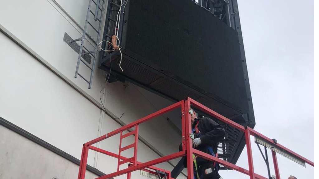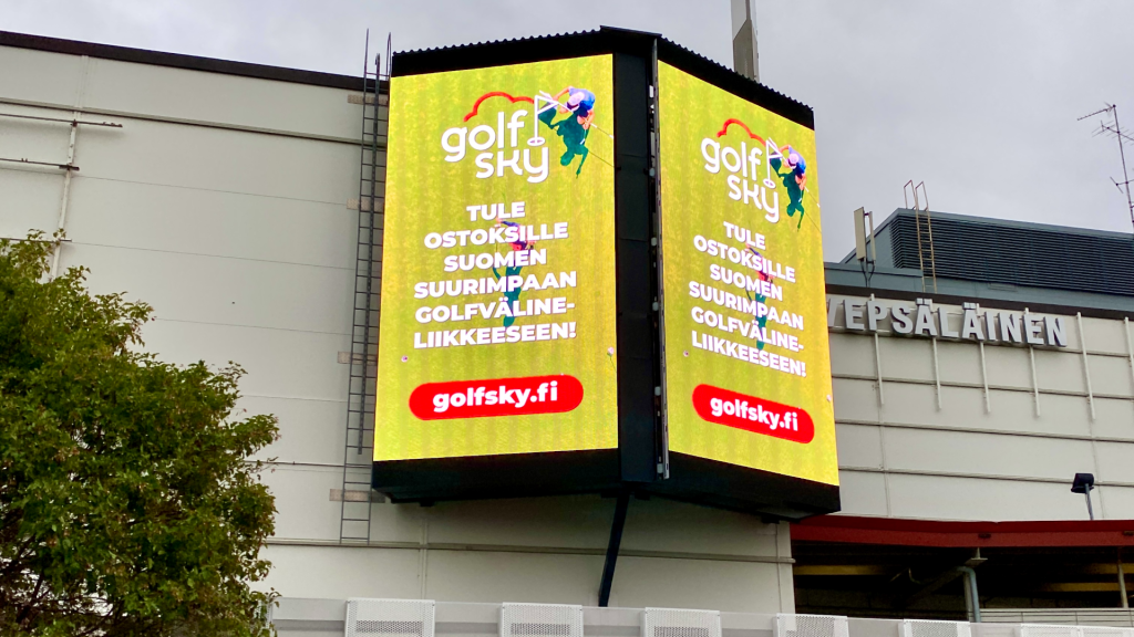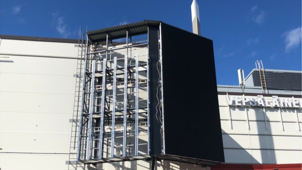 Asiakkaamme Ocean Outdoor tilasi meidät purkamaan vanhan jo tiensä päähän tulleen ulko-ledin ja asentamaan sen tilalle uuden entistä ehomman led-seinän. Alun purku-urakan jälkeen, asensimme ensin olemassa olevaan runkorakenteeseen uudet telineet uutta lediä varten. LED on asemoitu siten, että se näkyy Länsiväylän autoilijoille molempiin suuntiin ajettaessa ja se tavoittaakin päivittäin kymmeniätuhansia autoilijoita.