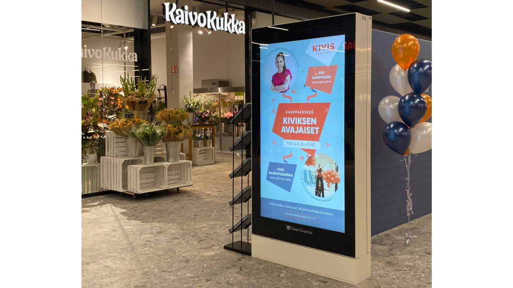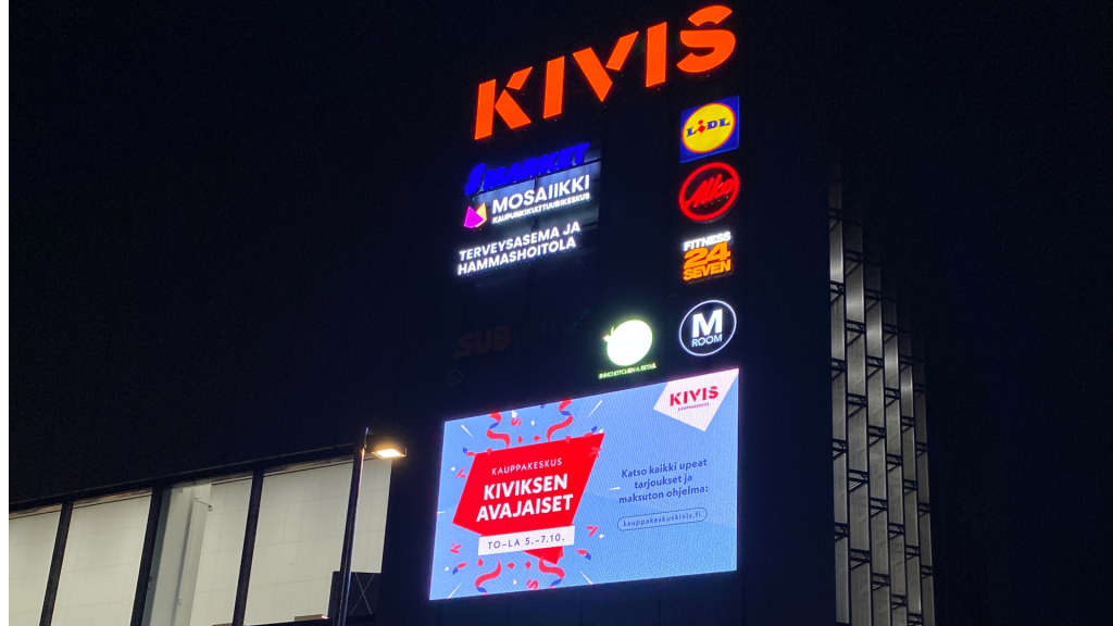 Toteutimme asiakkaallemme Clear Channelille Vantaalle uuteen Kauppakeskus Kivikseen perinteisten kaksipuoleisten mainos/opaste pylonien sekä LED-mainospinnan asennuksen. Lisäksi toimitimme ja asensimme samaan kohteeseen kauppakeskukselle itselleen näyttävän ulko-ledin keskuksen pääsisäänkäynnin välittömään läheisyyteen. Tämä LED näkyy pitkälle ja tavoittaa kauppakeskukseen suuntaavien asiakkaiden lisäksi myös ohikulkevaa liikennettä.