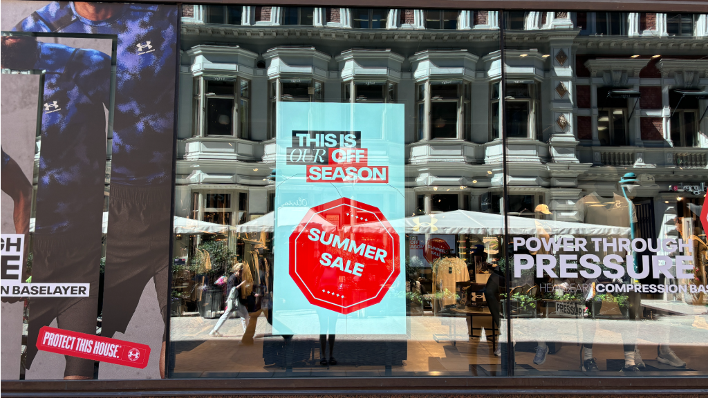 Ikkunanäyttö kiinnittää ohikulkijoiden katseen ja kutsuu ostoksille upouuteen Under Armour Suomen lippulaiva myymälään Kluuvikadulla!
