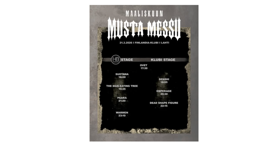 Maaliskuun Musta Messu -metallitapahtuman järjestäjä on Black March Events. Kahdeksas Maaliskuun Musta Messu järjestetään lauantaina 21. maaliskuuta 2026 Lahden Finlandia-klubilla, ja se tarjoaa monipuolisen kattauksen metallimusiikkia, pääesiintyjänään Warmen. HB Promotion isännöi festivaalin päälavaa ja vastaa tapahtuman virallisista logotuotteista. Toteutamme festivaalipaidat ja -lippikset, joita on saatavilla tapahtumassa sekä HB Promotionin showroomissa ja verkkokaupassa.