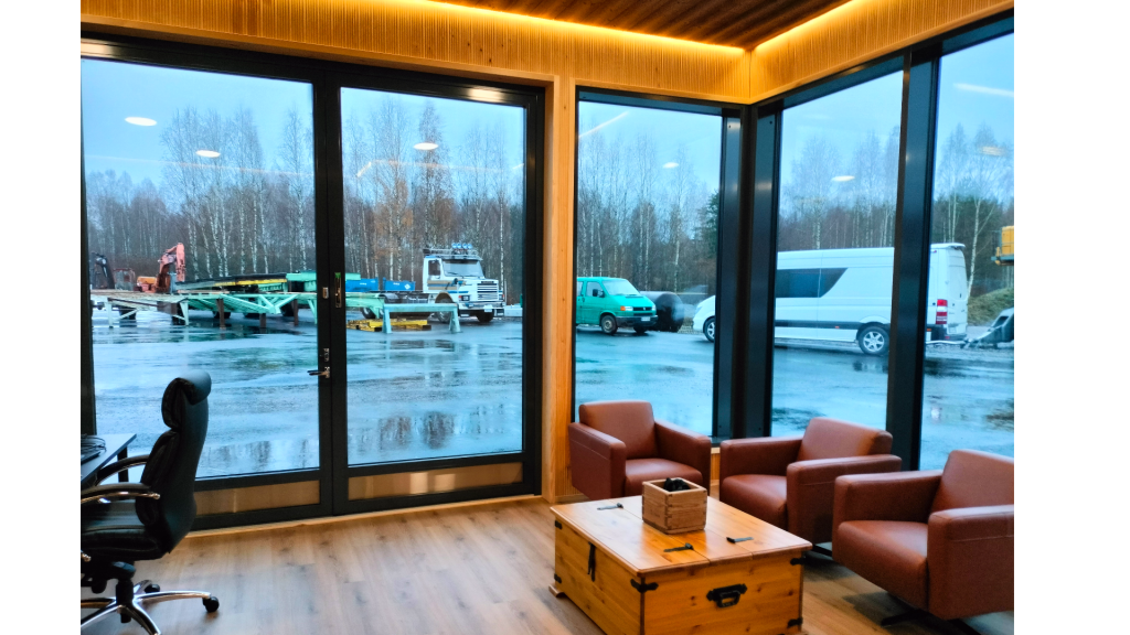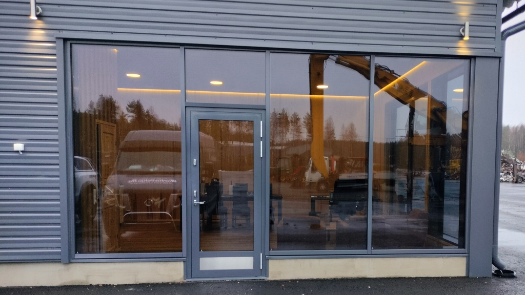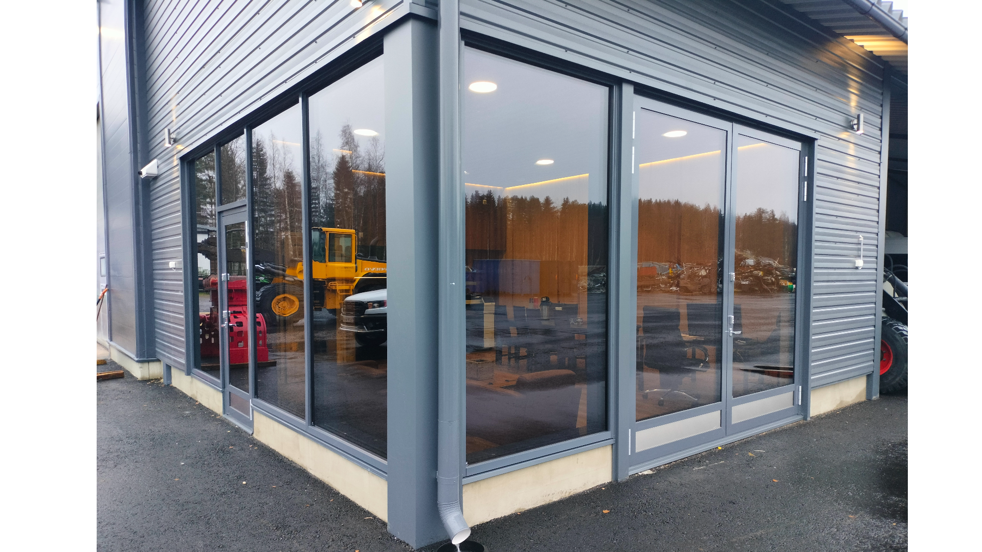 HTR-Steel Oy asensi hallikiinteistön toimistoon yrittäjän toiveiden mukaiset lasiseinät ja ovet.