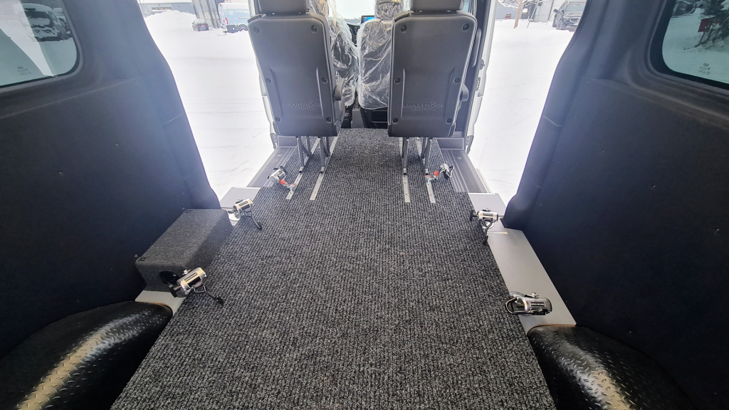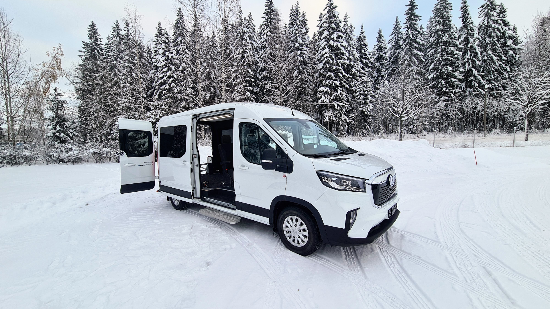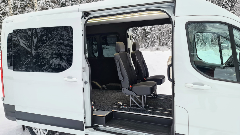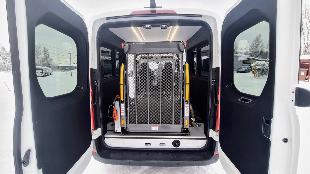 Eristimme ja verhoilimme Maxus edelivery 9 sisätilat matkustuskäyttöön. Lisäksi asensimme 2kpl jatko-ohjaamoistuimia sekä pyörätuolihissin takaoville. Autoon asennettiin myös polttoainekäyttöinen sisätilan lämmitin pitämään huolta matkustamon lämmityksestä.