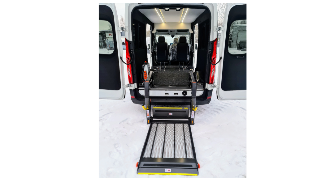 Maxus eDeliver 9 sähköpakettiauton varustelu pyörätuolihissillä.