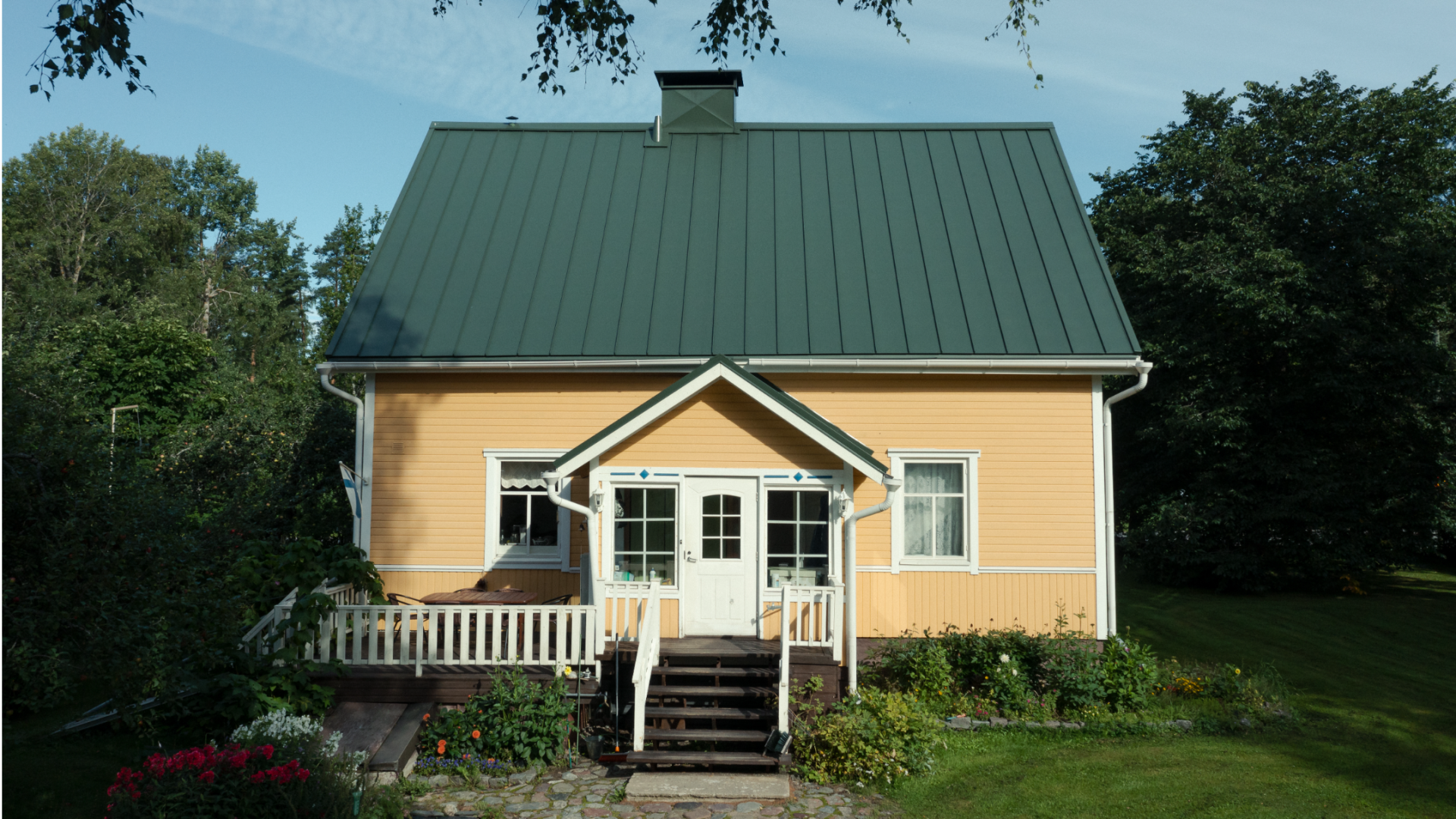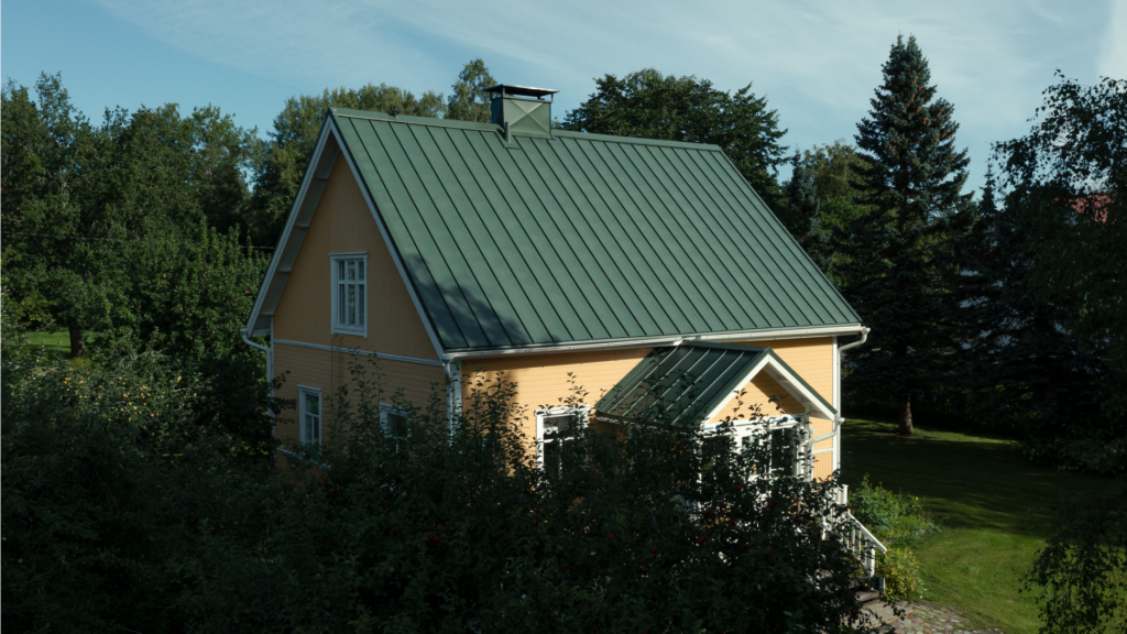 Vanha poimupelti ja alta löytynyt huopa-/pärekate purettiin, lahovaurioituneet rakenteet uusittiin. Aluskatteeksi asennettiin Divoroll, ja peltikatteeksi Ruukki Classic RR11. Samalla asiakkaalle uusittiin kattoturvatuotteita ja osia sadevesijärjestelmässä (vanhat alastulot ja seinätikkaat hyödynnettiin).