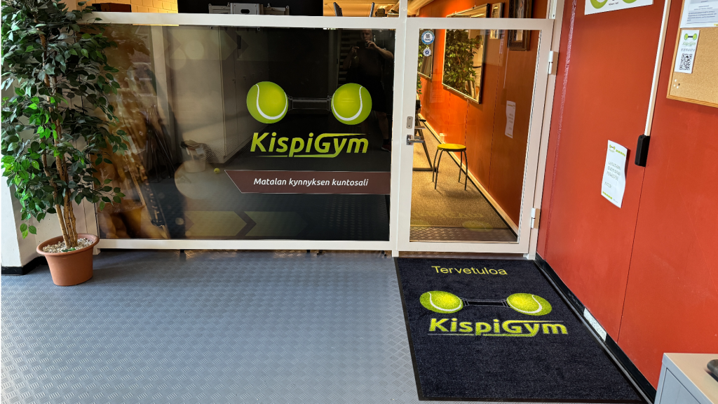 KispiGym on kuntosali Lahden Kisapuiston perinteisessä liikuntaympäristössä. KispiGymin sijainti Lahden Tennis- ja Squashkeskuksessa tarjoaa viihtyisän ja urheilullisen ympäristön nykyaikaiseen ja monipuoliseen saliharjoitteluun. KispiGymin omistajat tiesivät, että ensivaikutelma lasketaan jo ennen kuin ensimmäistä painoa on nostettu. Saliin kulkiessaan asiakkaat kohtasivat kuitenkin tenniskentiltä kantautuvaa pallonöyhtää, joka latisti tunnelmaa ja teki toiminnallisesta tilasta epäsiistin näköisen. Yhteistyössä Kiinteistöasennus Oy:n kanssa ongelmaan löytyi ratkaisu, joka yhdisti käytännöllisyyden ja brändin näkyvyyden: logomatot. Nyt asiakkaat astuvat sisään KispiGymin omaa ilmettä kantavien, laadukkaiden mattojen kautta. Ne pysyvät siististi paikoillaan, keräävät kengistä nöyhtän ja ovat helppoja pitää puhtaina. Mutta ennen kaikkea: ne kohottavat fiilistä heti ensiaskeleista lähtien. Asiakkaan sivut: https://kispigym.fi/
