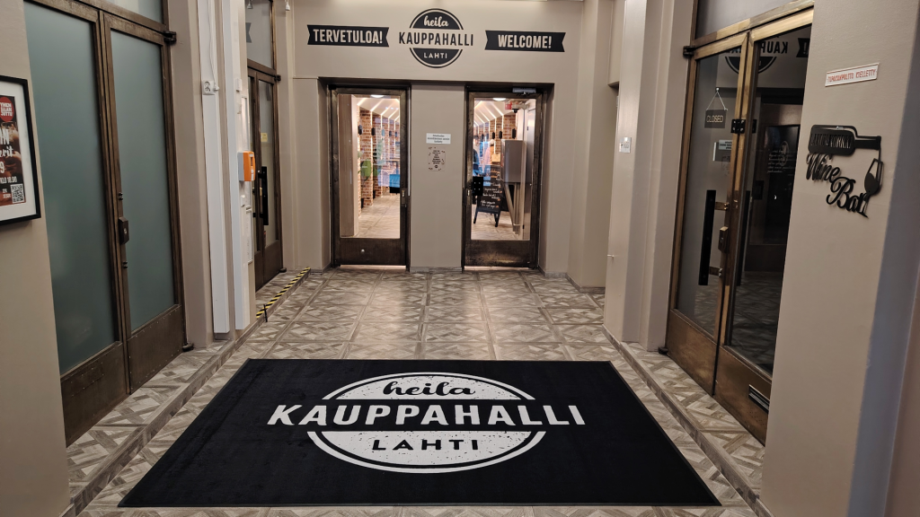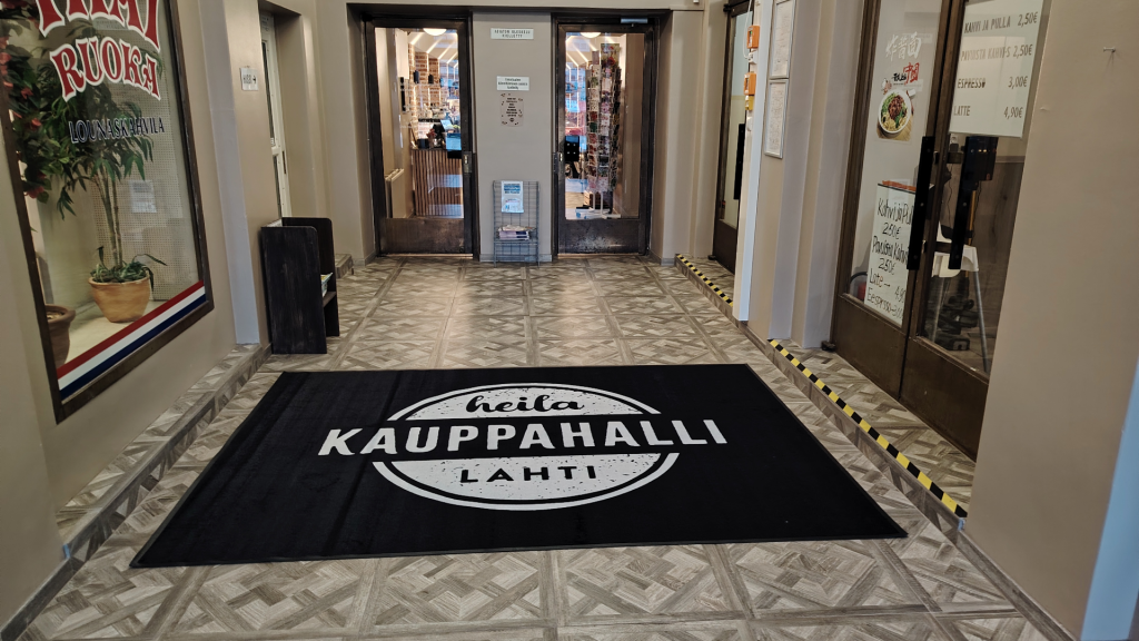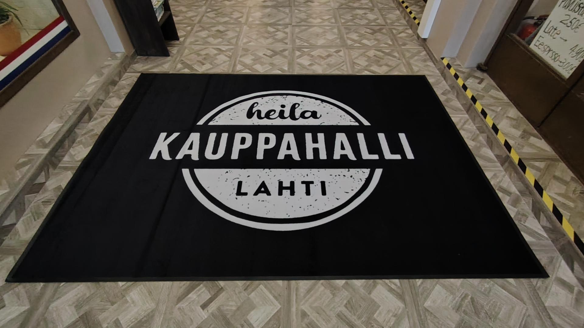 Kohteeseen teimme sekä tuulikaappi, että logomatot. Katso toinen referenssi tuulikaappimatosta! Logomaton logo haluttiin valkoisella ja pohja mustalla. Täten käänsimme logon värit ympäri ja laitoimme matot tehtaalle valmistukseen. Logomatot valmistetaan Euroopassa ja tehdään suoraan meille tilauksesta. Normaalisti teossa ja toimituksessa menee yhteensä noin vajaa kuukausi. Samoin oli näiden mattojen kanssa. Nyt matot ovat paikoillaan ja asiakkaat näkevät suuren logon maassa heti sisään tultuaan. Logomatto tuo sisäänkäyntiin todella paljon näyttävyyttä sekä putsaa kenkiä samalla. Meiltä kaiken kokoiset logomatot onnistuvat! Tähän kohteeseen laitoimme 2metriä x 2,8metriä matot molemmille sisäänkäynneille.