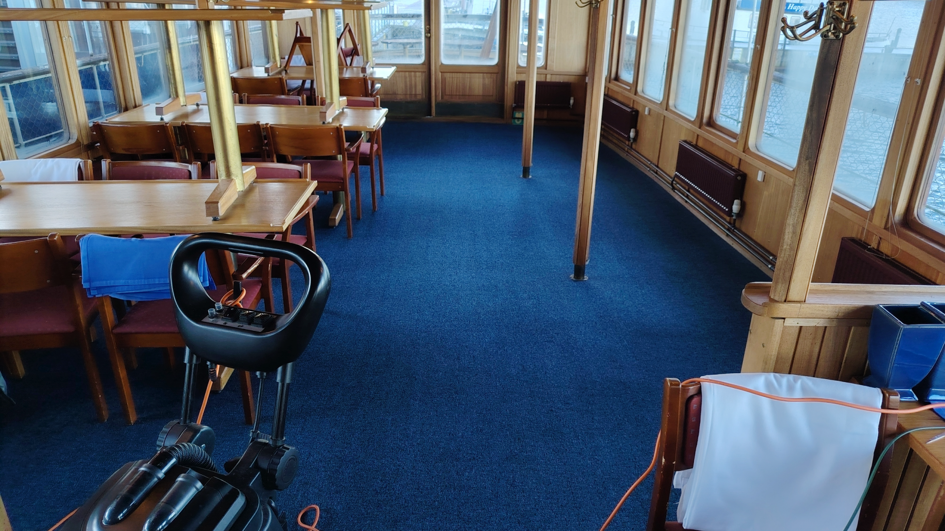 Meidän liikuteltavalla mattopesurilla onnistuu niin kokolattia- kuin käytävämattojenkin laadukas pesu suoraan kohteessa. Laita pesee, harjaa sekä kuivaa maton ja pesun jälki on parempaa kuin pesulassa tai näin minulle on ainakin kehuttu työnjälkeä asiakkaiden toimesta. Nyt laivan matot ovat taas puhtaat ja valmiit kaikkiin tapahtumiin joita Pelicans vain keksii laivalle.
