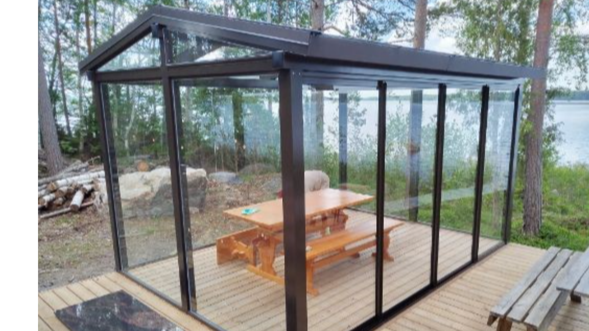 Lasiterassikohde on järven rannassa tuulisella paikalla, jolloin rakenteelta vaaditaan jäykkyyttä olosuhteet huomioiden. Lasiterassin kolmelle sivulle haluttiin kiinteät lasit ja yhdelle sivulle liukulasit, jotka aukeavat lähes koko aukon leveydeltä. Kattolasit on karkaistuina, jotka kestää lumikuormat hyvin. Kirkas lasi ja tumman ruskea rungon väri sopii hienosti ympäristöön. Samaan paikkaan toteutettiin aiemmin terassin liukulasit päärakennuksen yhteyteen edellisenä vuotena. Lasiterassi haluttiin varsinaisesti kesäkeittiökäyttöön, jossa on samalla tehokas tuulen suoja rannassa, mutta myös mahdollisuus kunnon ilmanvaihtoon. Asiakas on ollut todella tyytyväinen toimitettuun lasiterassiin.