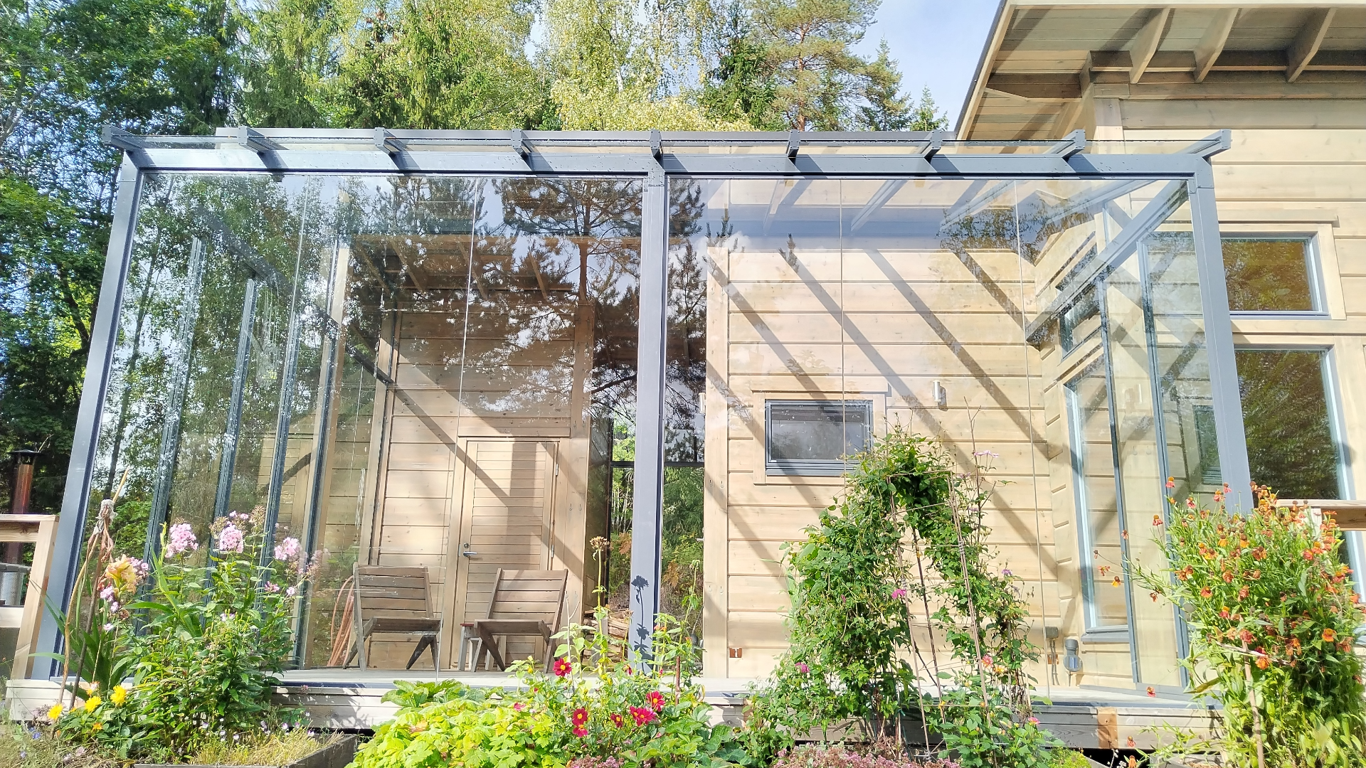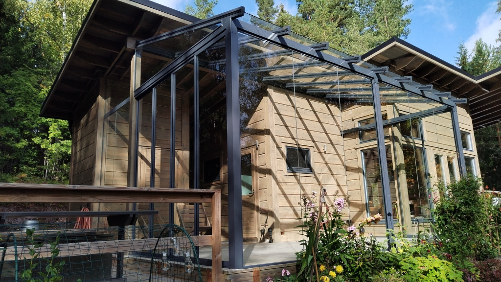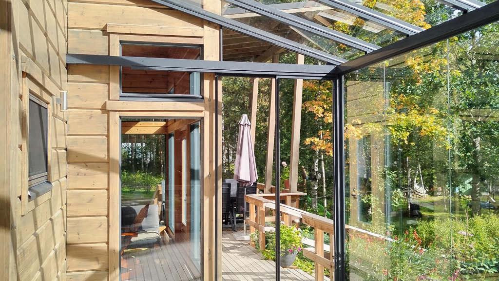 Kohteeseen asennettiin alumiinirunkoinen terassirakenne, siihen kattolasit karkaistulla lasilla, liukuovet alumiinikehyksillä. Kiinteät lasit järvelle päin haluttiin mahdollisimman eleettöminä eli ilman kehyksiä. Lasituksella yhdistettiin eri huonetilojen parempi käyttö myös talvella. Tumman harmaa kehyksen väri sopii hyvin olemassa olevaan hirsiseinään