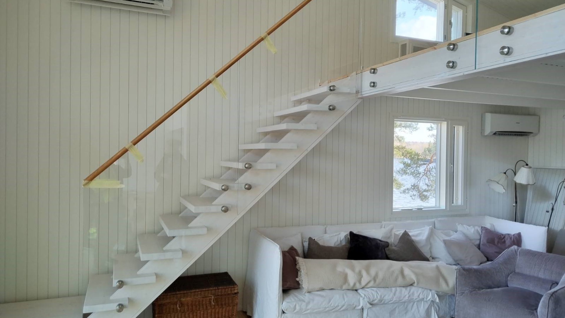 Kohteeseen asennettiin karkaistut laminoidut täysin kirkkaat lasikaiteet rst-pistekiinnikkeillä. Porrasnousun lasit kiinnitettiin porrasaskelmien reunaan kiinni, eli mitoitus oli tarkkaa. Lasien yläreunassa on tamminen käsijohde porrasnousun osalla. Porrasnousuun lasien kiinnitys askelmien etupintaan onnistui hyvin ja kiinnitys oli varsin tukeva. Hieno tamminen käsijohde tukee vielä lasien kiinnitystä. Yläkerran parvella olevat kirkkaat lasit mahdollistaa näkymän ulos järvelle. Asiakkaalle oli tärkeää, että lasit on täysin kirkkaita laseja eli ns rautaoksidivapaata lasia. Lasin vihreys on siis täysin poistettu lasista, joka korostuisi lasin kokonaispaksuuden ollessa 12mm. Asiakas oli todella tyytyväinen toimitettuun lasikaideratkaisuun.