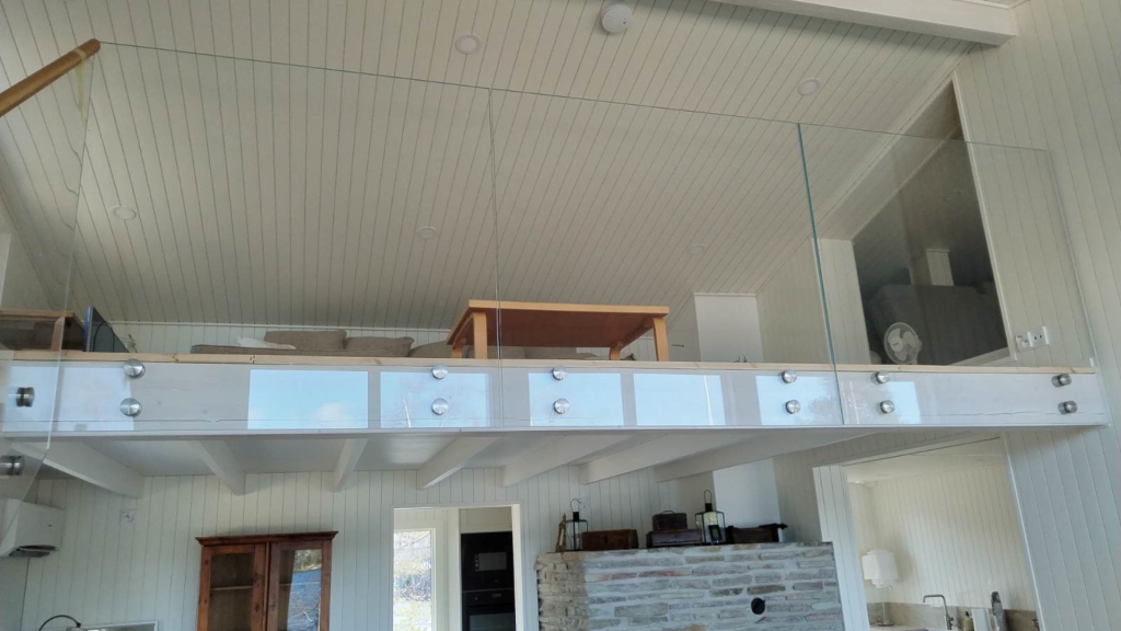 Kohteeseen toteutettiin lasikaiteet porrasnousuun ja parvelle.
