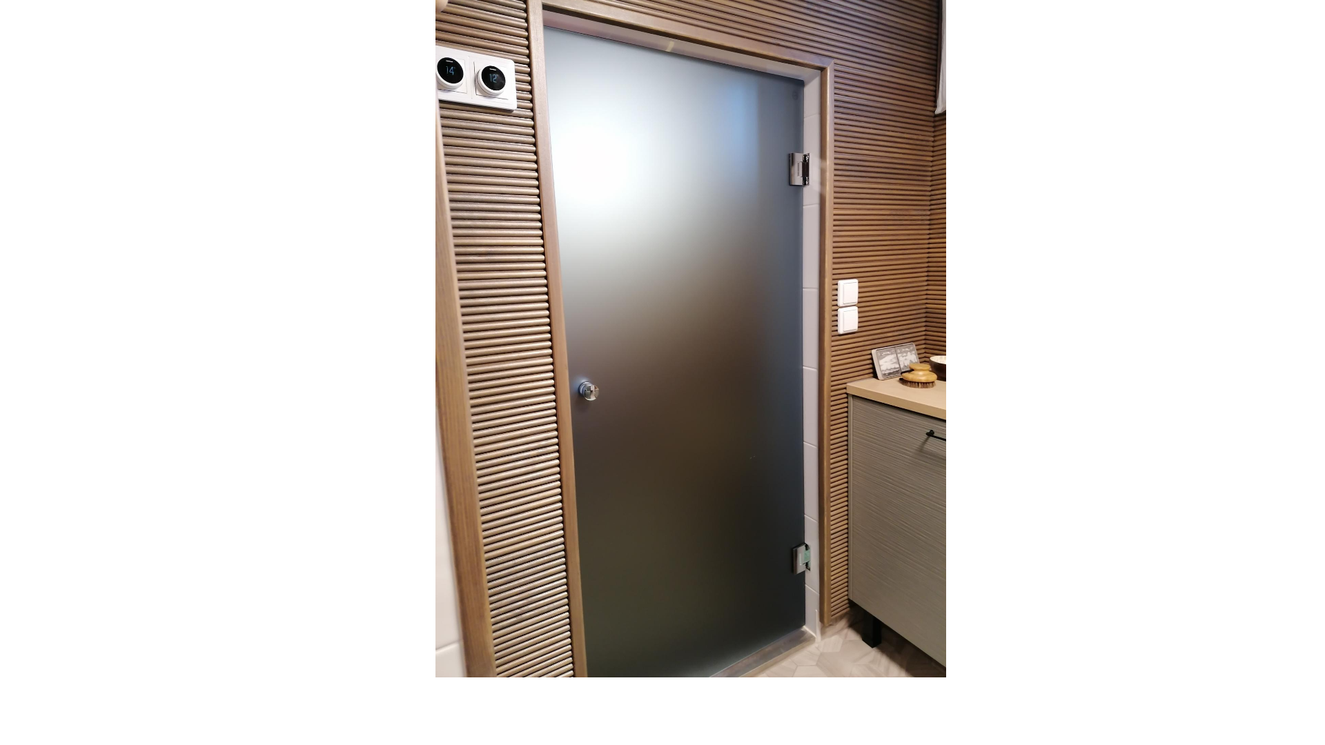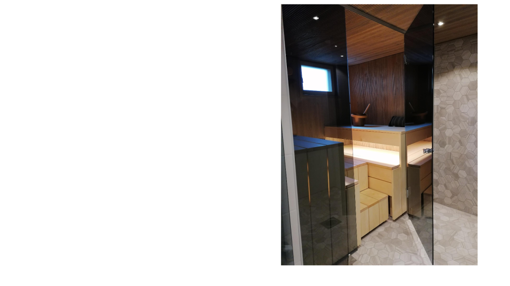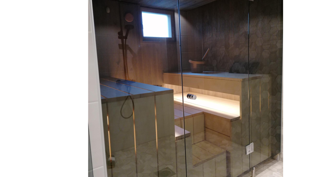 Kohteeseen toimitettiin mittojen mukaan saunan lasiseinä ja kostean tilan ovi.