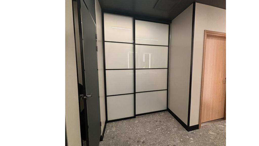 Asiakkaan remonttikohteeseen asennettiin mittojen mukaan kiinteä lasiseinä ja yläkantava liukuovi mustalla kehyksellä ja opaalilasilla. Tällä ratkaisulla erotettiin lastenhoitotila muusta wc-tilasta. Opaalilasilla valo tulee huoneesta toiseen, mutta saadaan yksityisyys huoneeseen. Liukuovi on katosta roikkuva, jolloin oviaukossa ei ole mitään kynnystä. Mustalla kehyksellä ja opaalilasilla saadaan näyttävä lopputulos.