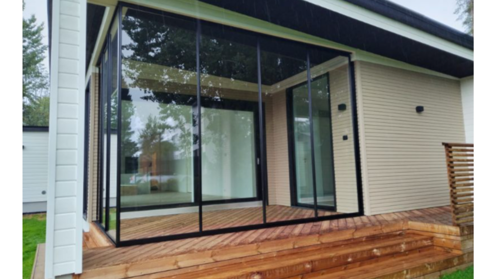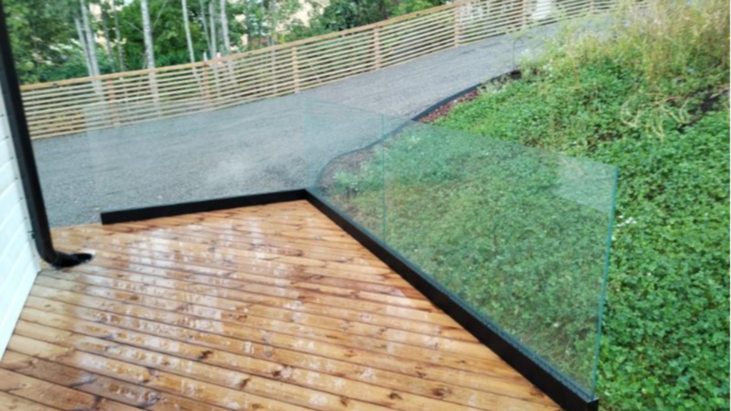 Maakunnan Lasi asensi kohteeseen mittojen mukaan saunan lasiseinän, terassien liukulasit ja lasikaiteet