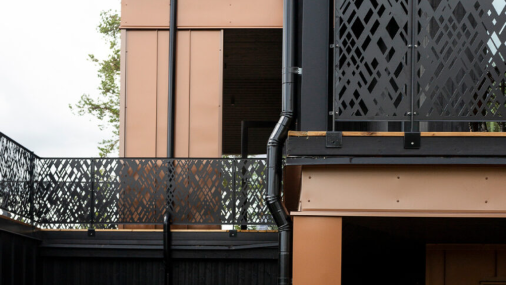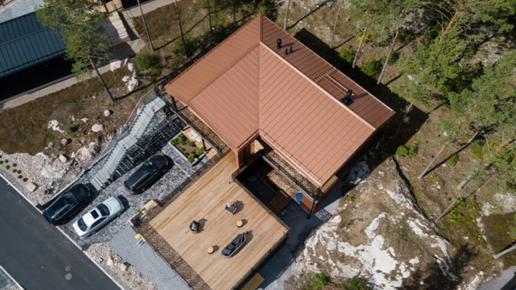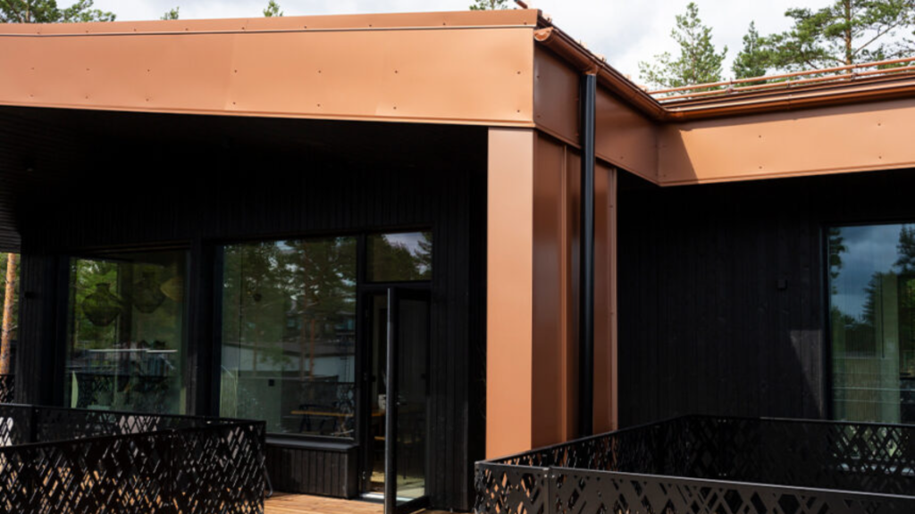 Kuparinvärinen kattopelti jatkuu sulavasti ulkoseiniin, muodostaen yhtenäisen ja vaikuttavan kokonaisuuden. Värin ansiosta katto heijastaa auringonvaloa tehokkaammin kuin perinteisempi musta kattopelti, pitäen näin sisätilat viileämpinä. Autotallin seinissä käytettiin kosteusrasitusta erinomaisen hyvin kestävää Metehe rivikattoa HC25-pinnoitteella värissä 33 musta. Kustannustehokas pinnoitettu teräslevy tarjoaa silkinhimmeän pinnan ja erittäin hyvän korroosionkestävyyden. Villa Pinnan seinissä ja katossa käytettiin Metehen toimittamaa lukkosaumapeltiä. Colorcoat® PVDF 35 -pinnoite on erityisen sopiva rakennuksen ulkopintoihin, joissa vaaditaan korkeaa korroosion- ja UV-säteilynkestävyyttä. Värivaihtoehtoja on runsaasti. Villa Pinnan kattopelti on toteutettu lukkosaumoilla, joiden etuna on, että ruuvikiinnitykset jäävät piiloon lukkopontin alle. Kattosillat ja turvatuotteet kiinnitetään suoraan saumoihin ilman ruuveja, mikä pidentää katon elinkaarta.