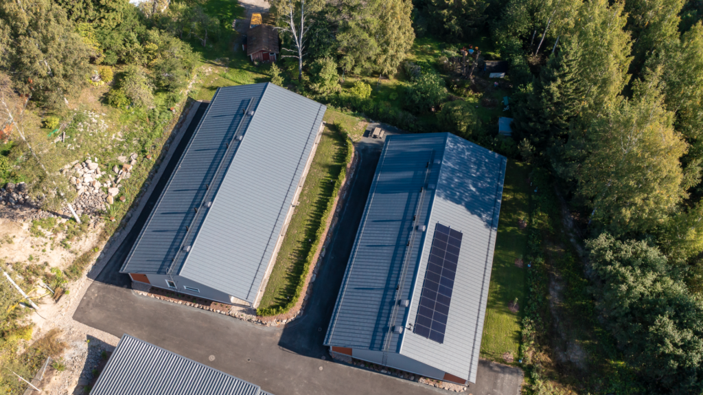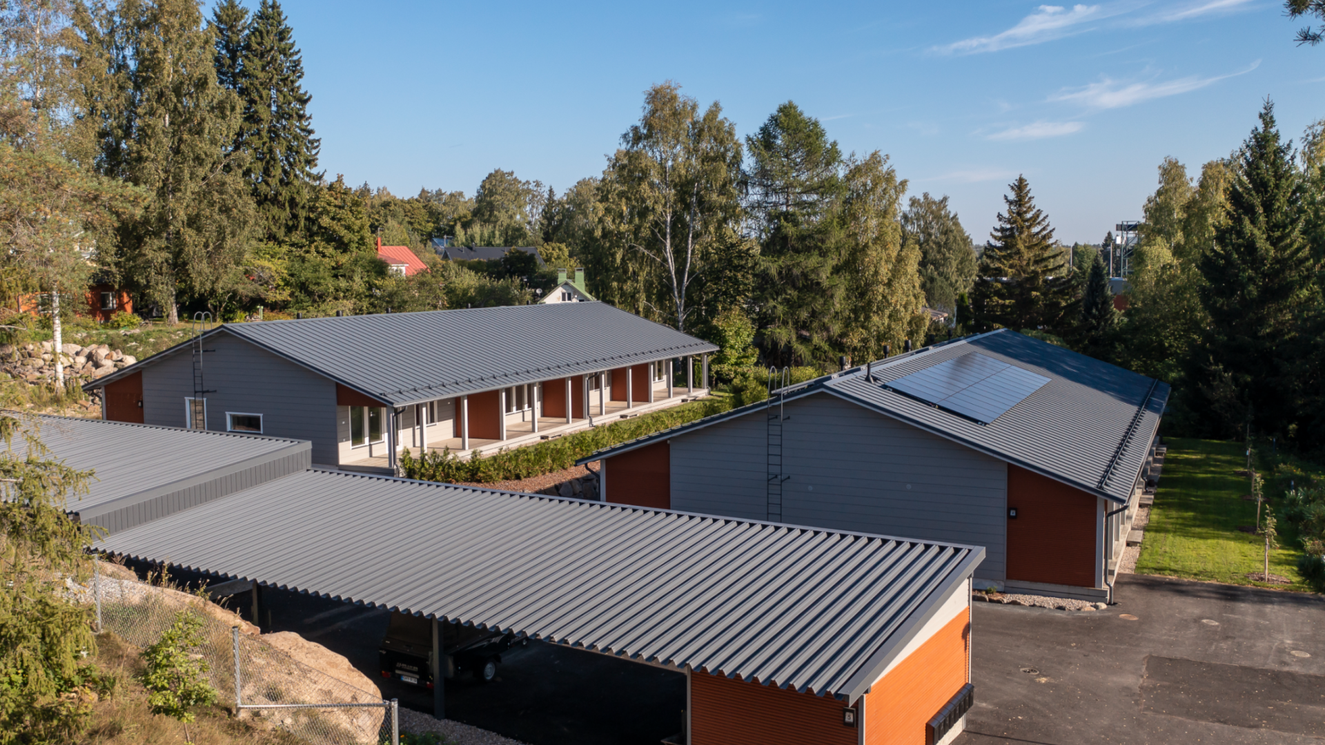 Lappeenrannan Myllymäkeen rakennettuun moderniin tulkintaan hirsitalosta toimitettiin suoraan työmaalle koko kattopaketti; kattopellit, listat, kattoturvatuotteet, sadevesijärjestelmät, läpivientituotteet ja asennustarvikkeet. Kohteeseen valikoitui kattoprofiiliksi Metehe Rivikatto sileäpintaisena SRT 35 -mallina, värissä 23 tummanharmaa. Metehe Rivikatossa yhdistyvät asennuksen helppous ja moderni, mutta ajaton muotoilu. Pinnoitteeksi valittiin pinnaltaan strukturoitu, himmeä takuupinnoite PUR Matta, joka soveltuu hyvin vaativaan ulko- ja sisäkäyttöön. Läpiviennit, kattoturvatuotteet, tikkaat ja sadevesijärjestelmä toimitettiin myös värissä 23 tummanharmaa. Autokatokseen toimitettiin lisäksi Metehe 15 Seinä A -profiilia värissä 23 tummanharmaa. Pinnoitteeksi valittiin PUR, joka on vaativaan ulko- ja sisäkäyttöön soveltuva pinnaltaan strukturoitu, puolikiiltävä takuupinnoite, jonka tekninen takuu on PUR Matta -pinnoitteen tavoin 50 vuotta.