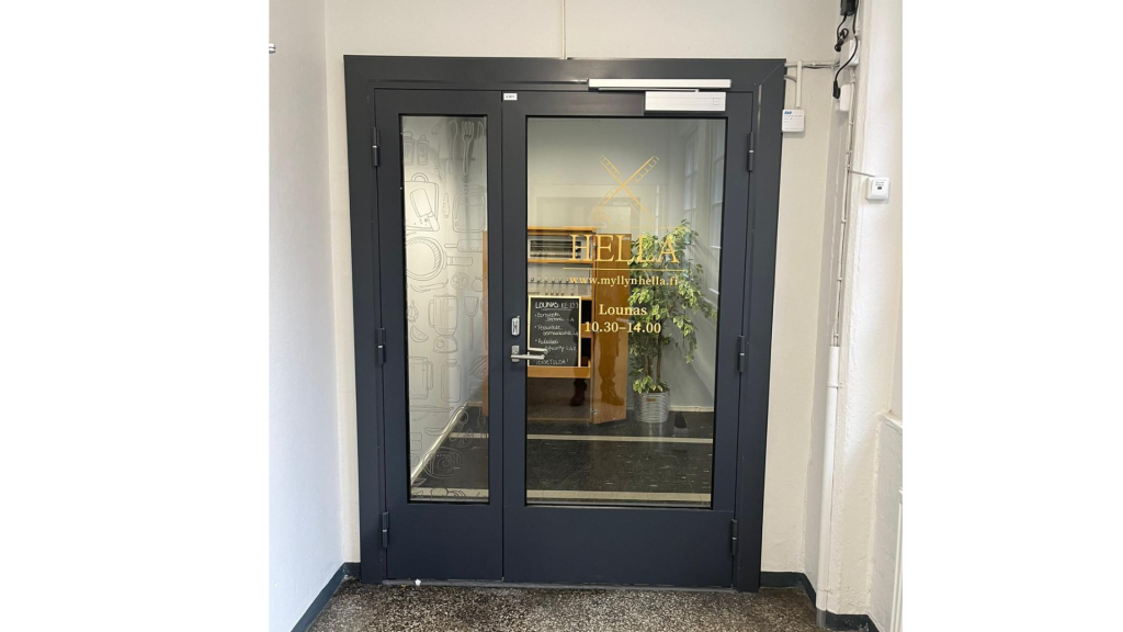 Kuvitimme seinät ja sisääntulon grafiikat. Hyväksynnän jälkeen toteutimme seinien ja sisääntulon teippauksen