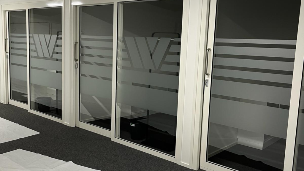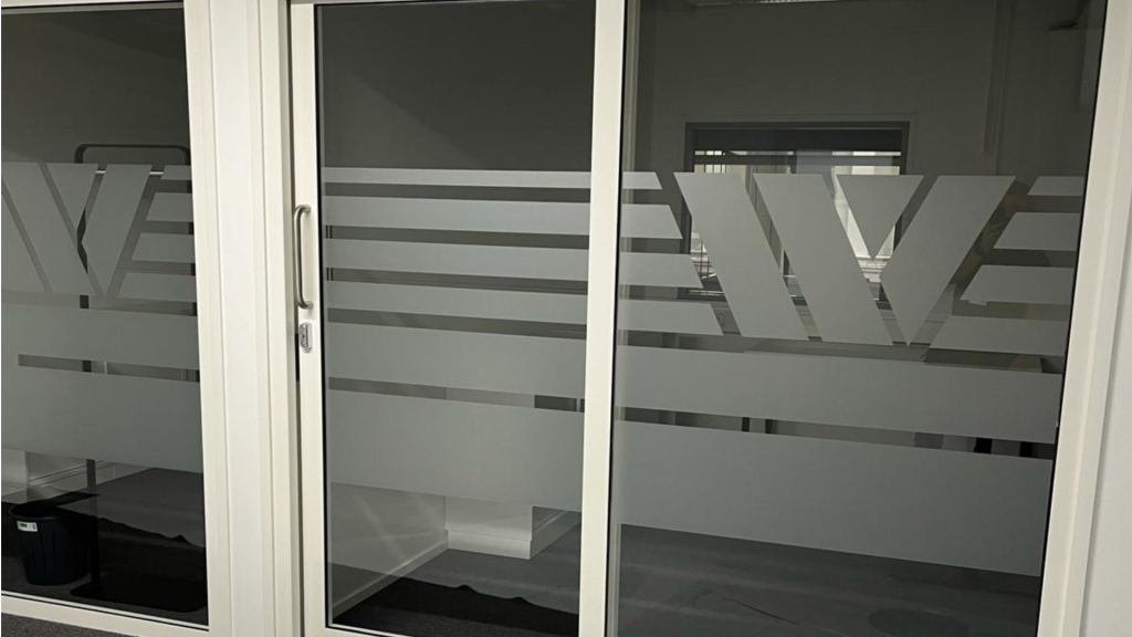 Suunnittelimme ja toteutimme Wipakille kokoustiloihin hiekkapuhalluskalvosta brändin mukaiset näkösuojateippaukset