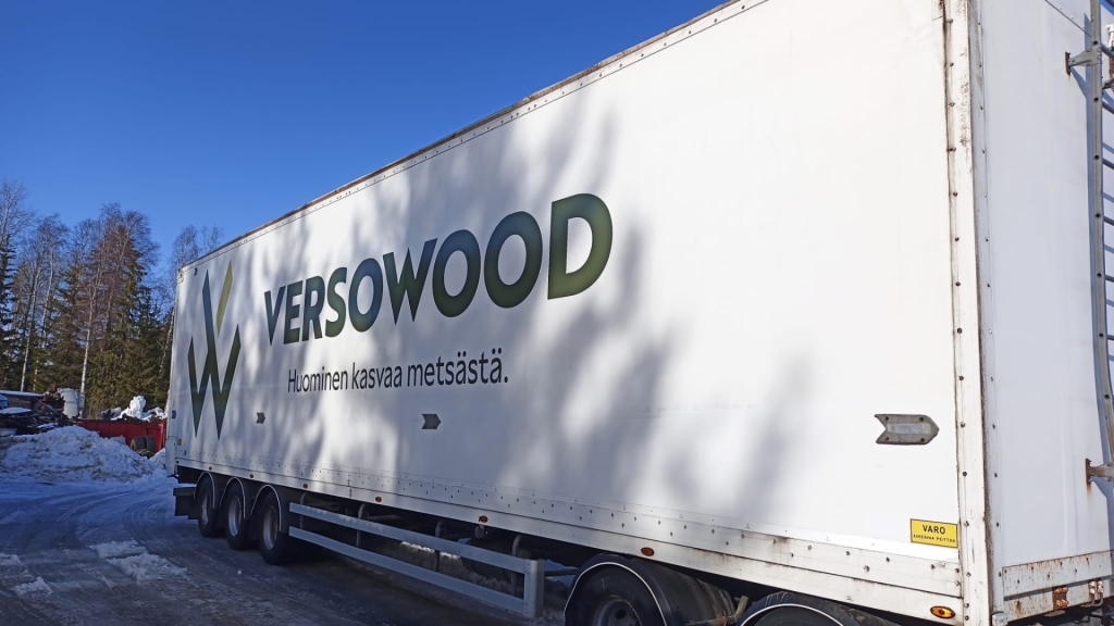 Vuosien aikana olemme teipanneet rekkoja ja pakettiautoja Versowoodin uuden brändin mukaiseksi. Nuppi yliteipattiin vihreäksi ja kylkiin uudet isot Versowoodin logot