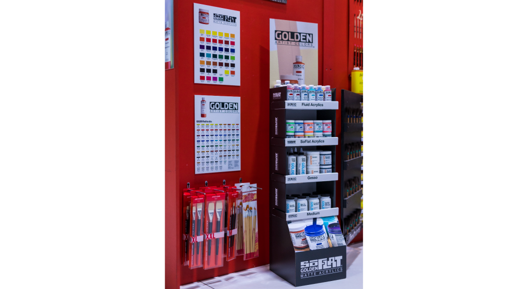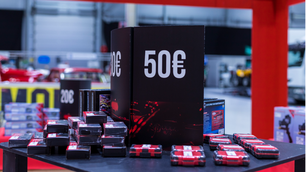 Seinän logot teimme tulostettuina ja muotoonleikattuina kohokuvioina. Seinäkuvat, sekä pöytien displaykuvat tulostettuna kevytlevyille. Pahvinen displaytuote-teline on suunniteltu ja tulostettu asiakkaan omilla logoilla ja kuvilla, tuote on kevyt ja helppo kasata. Lisäksi työntekijöille prässättiin messutapahtumaan paidat logolla.