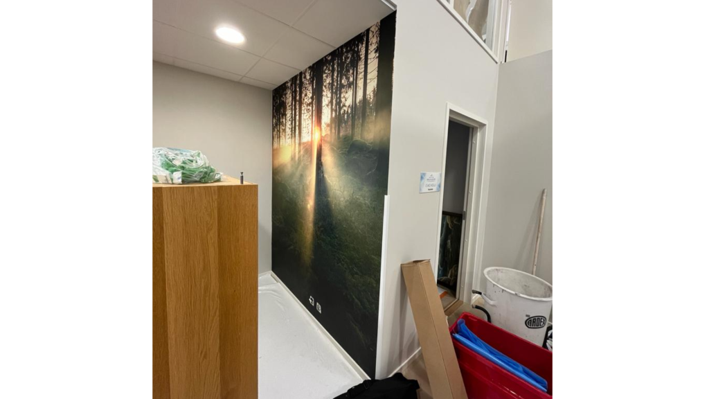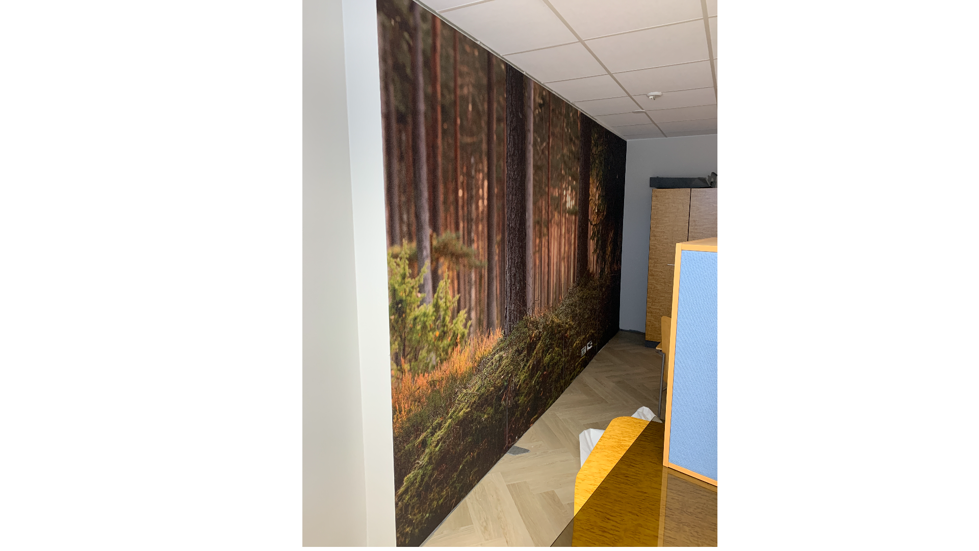 Toimistoremontin yhteydessä huoneisiin ja käytäville asennettiin asiakkaan valitsemista kuvista seinille tulostettavalle tapetille tehtyjä kuvia. Asennus on helppoa jopa itse asentaa, asennusperiaate on sama kuin normaalissa tapetissa.