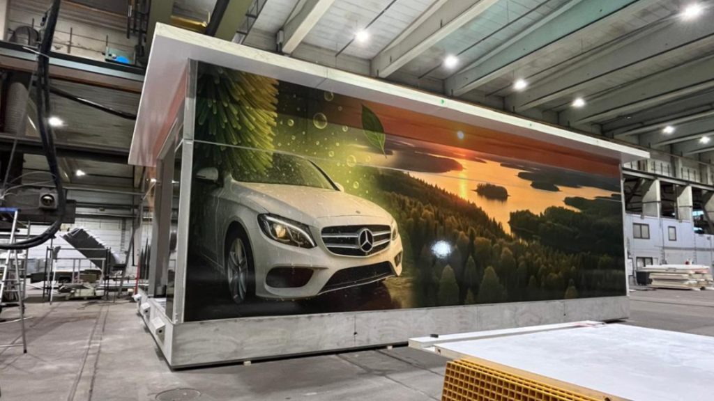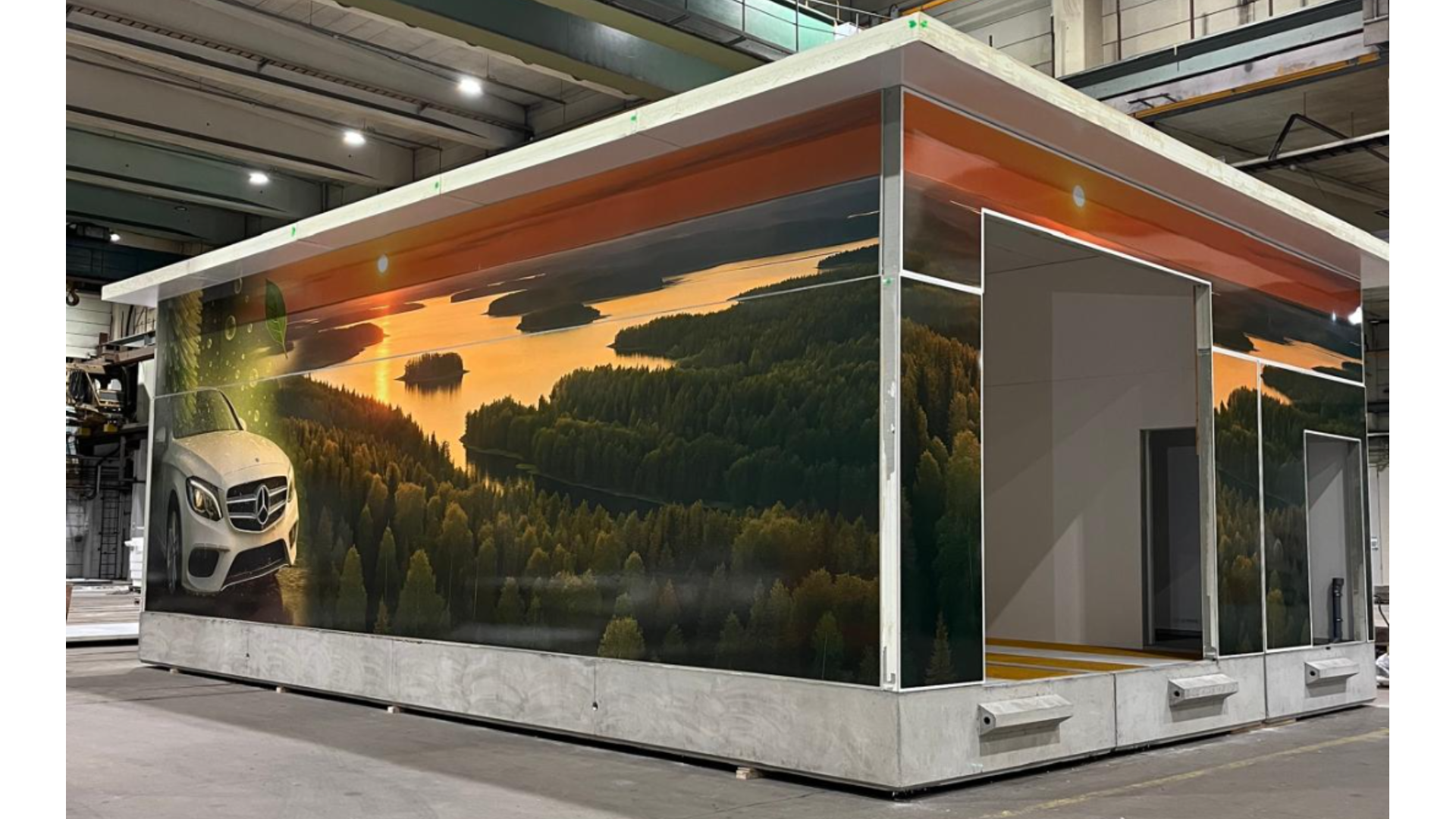 Autopesula teipattiin kahdessa päivässä ja lopputulokseen oli tyytyväinen niin me kuin tilaajakin. Tämä mahdollistaa jos ja kun moduleita myydään useampi, niiden kaikkien pintojen tulostettavuuden asiakkaan brändillä.