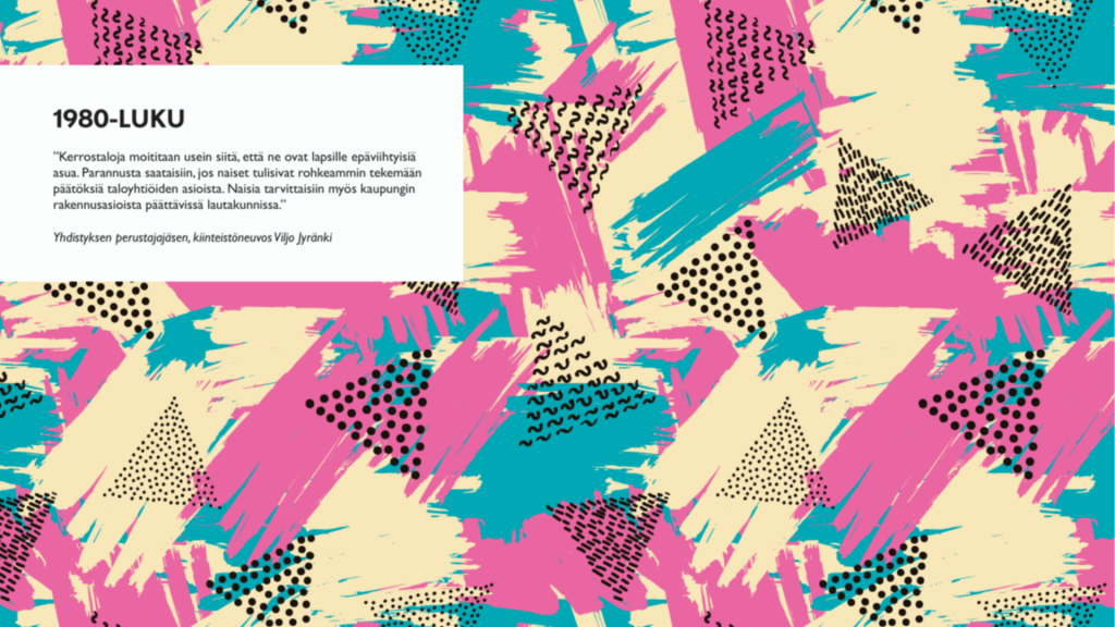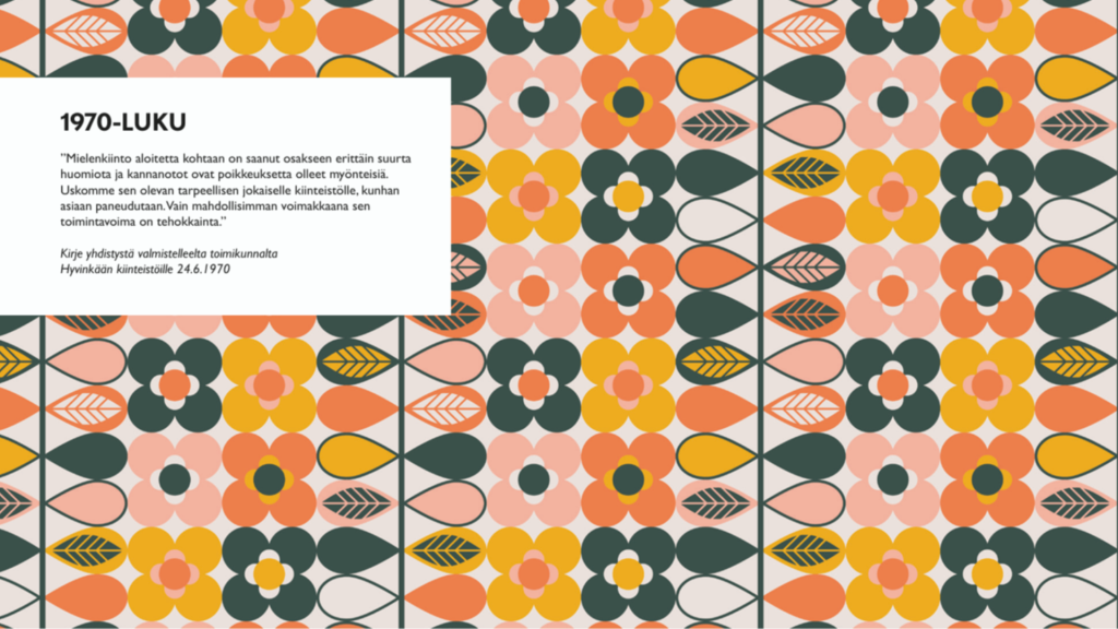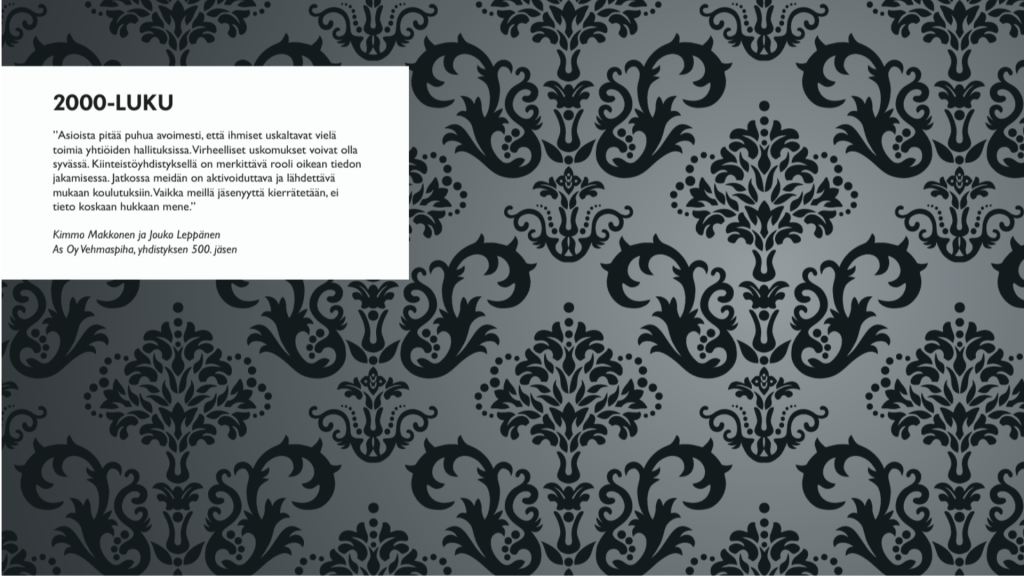 Historiikkiprojekti ei ole pelkkää arkistomappien kahlaamista, haastatteluja ja kirjoittamista. Kaikki lähtee jälleen kerran huolellisesta suunnittelusta: mielenkiinnon herättävä julkaisu vaatii oivaltavan rakennesuunnittelun. Tekstin ja visuaalisuuden on pelattava yhteen alusta loppuun. Graafisen suunnittelun roolia ei voi väheksyä. Asioita voi kertoa niin monella tapaa: mikä olisi juuri tässä teoksessa toimivin ratkaisu? Aivan samoin kuin lehti, myös kirja voi sisältää useita erilaisia sisältötyyppejä: pitkää kronologista kerrontaa, syventäviä knoppitarinoita, teemapalstoja ja visuaalisia tekstinostoja. Kiinteistöyhdistyksen haasteena oli vähäinen valokuvamateriaali ensimmäisiltä vuosikymmeniltä. Niinpä asiakkaan kanssa tehtiin melko radikaali ratkaisu: historiikissa ei ole juuri lainkaan valokuvia, vaan visuaalisuuden punaisena lankana toimivat vuosikymmenille ominaiset tapettikuosit sanallista kerrontaa elävöittämässä. Visuaalista mielenkiintoa voi herättää monin tavoin.