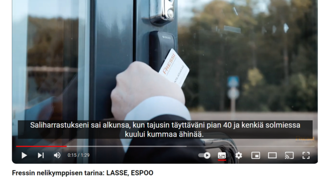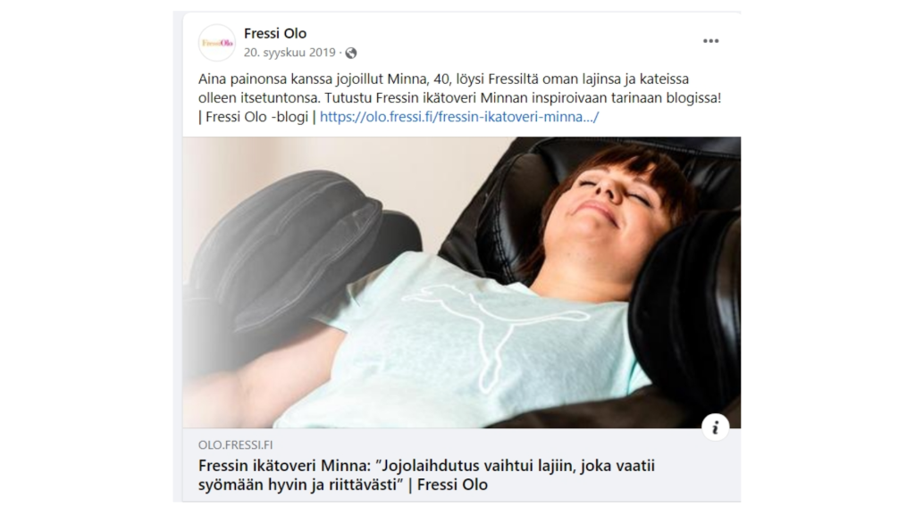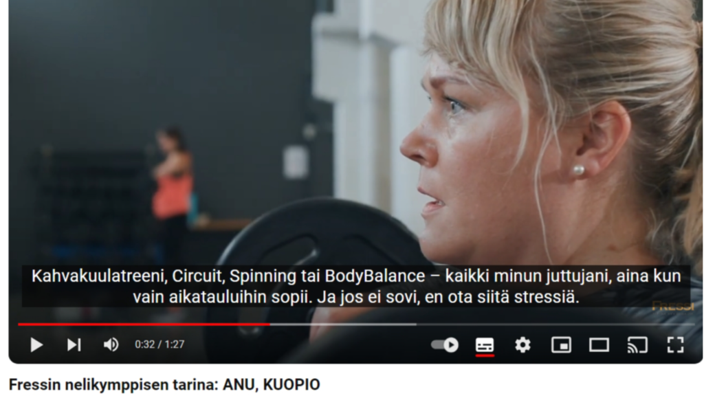Suomalainen Fressi täytti 40 vuotta 2019. Juhlavuoden markkinoinnin mainoskasvoiksi kutsuttiin Fressin ikätovereita omasta asiakaskunnasta. Kolme nelikymppistä kuntoilijaa kertoo videoilla omat hyvinvointitarinansa. Koska videokäsikirjoitusta varten oli kuitenkin tehtävä perusteellinen taustahaastattelu, ehdotin asiakkaalle, että tehdään kampanjaan myös kirjoitetut asiakastarinat Fressin blogiin. Näin huomioidaan erilaiset median käyttäjät: osa mieluummin lukee, osa katselee videoita. Toteutukset täydentävät toisiansa loistavasti ja niitä voidaan hyödyntää keskenään erilaisissa yhteyksissä. Videosarjan teknisenä toteuttajana toimi luottokumppanini lahtelainen Inspiroiva Creative.