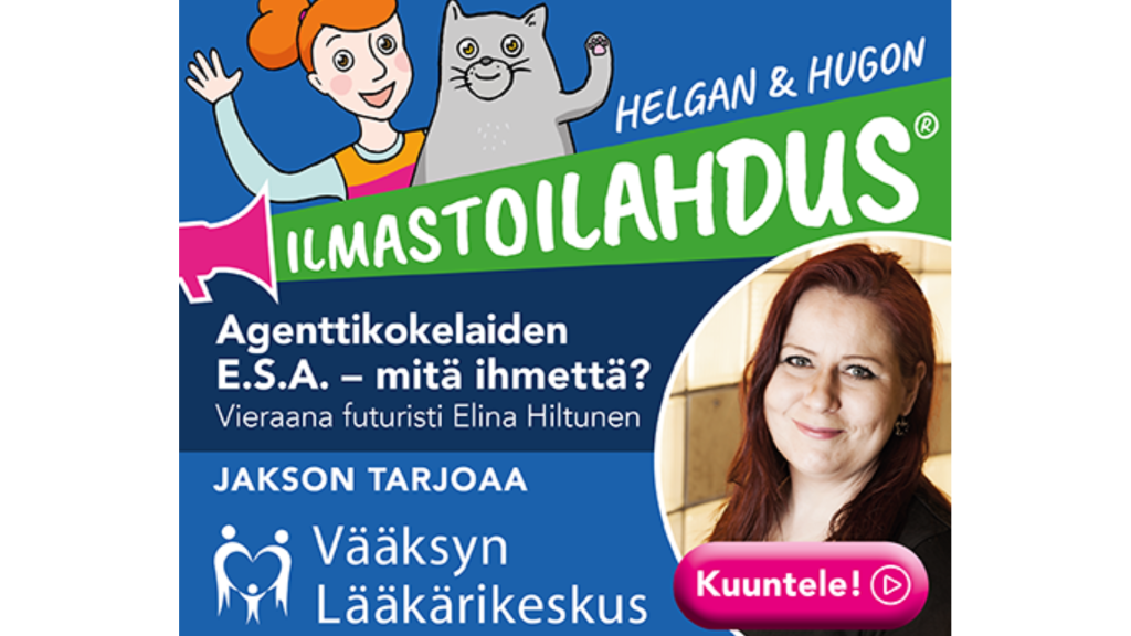 Spotifysta löytyvä Helgan ja Hugon ilmastoilahdus on koko perheen podcast-sarja, jossa Merkityskirjojen sankarit, Helga Hidalmiina ja Hugo-kissa, etsivät arkisia ilmastoilahduksia yllätysten täyttämällä ilmastoagenttiseikkailulla. Sarjassa he tutustuvat salaisiin agenttikouluttajiin ja kokevat monta hauskaa ja opettavaista hetkeä. Sarjaan liittyvää tehtävämateriaalia lapsille voi tulostaa osoitteesta merkityskirjat.fi/ilmastoilahdus, joten se sopii hyvin kuunneltavaksi vaikkapa alakoulujen oppitunneilla. Ikäsuositus on noin 5-vuotiaista kaikenikäisiin, joita ilmastoilahdutus innostaa! 🌿🎧 Sarjan tuotanto rahoitettiin yrityskumppaneiden tuella. Lämmin kiitos merkityksellisestä yhteistyöstä Vääksyn Lääkärikeskus, Nivos, Lahden Musiikkiopisto, Purkupiha ja Etelä-Suomen Sanomat.