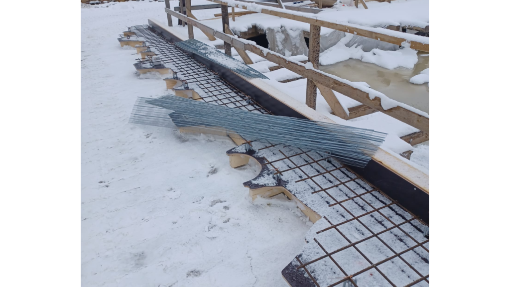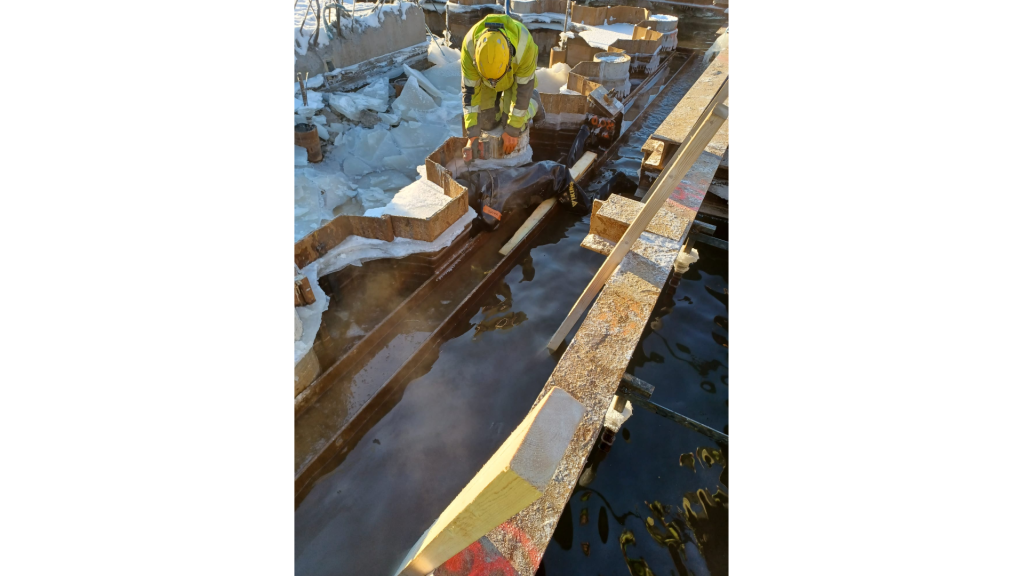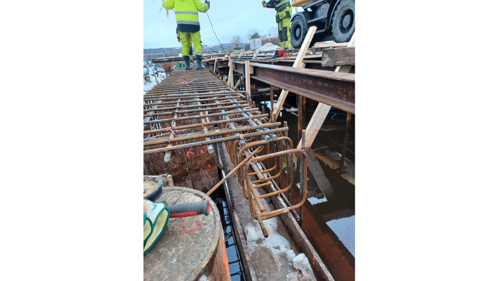 Espoon Meritorin tulvasuojuksen rakennustyöt. Muotit ja raudoitushäkit valmistellaan mahdollisimman pitkälle kuivalla maalla ja siirretään sitten elementteinä rantaveteen, hyistä hommaa.