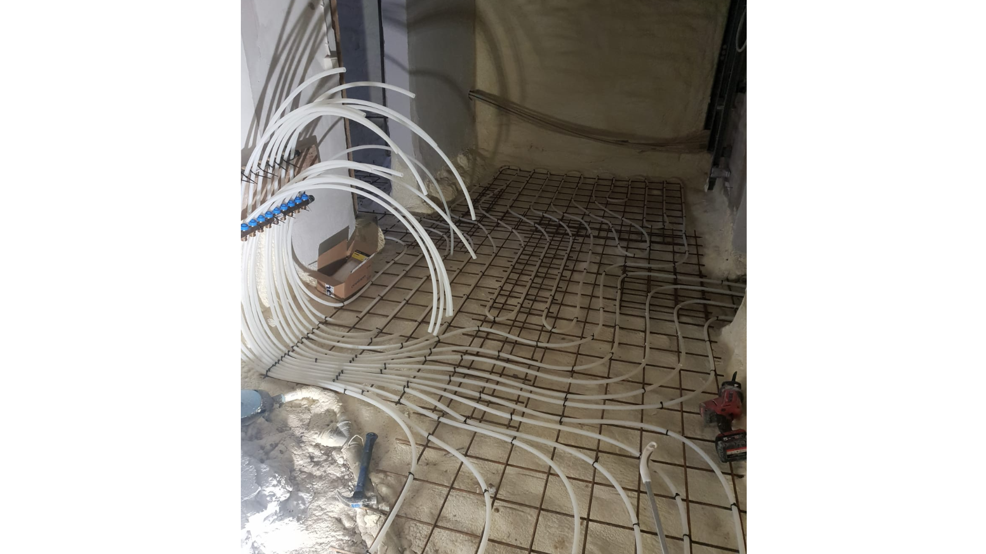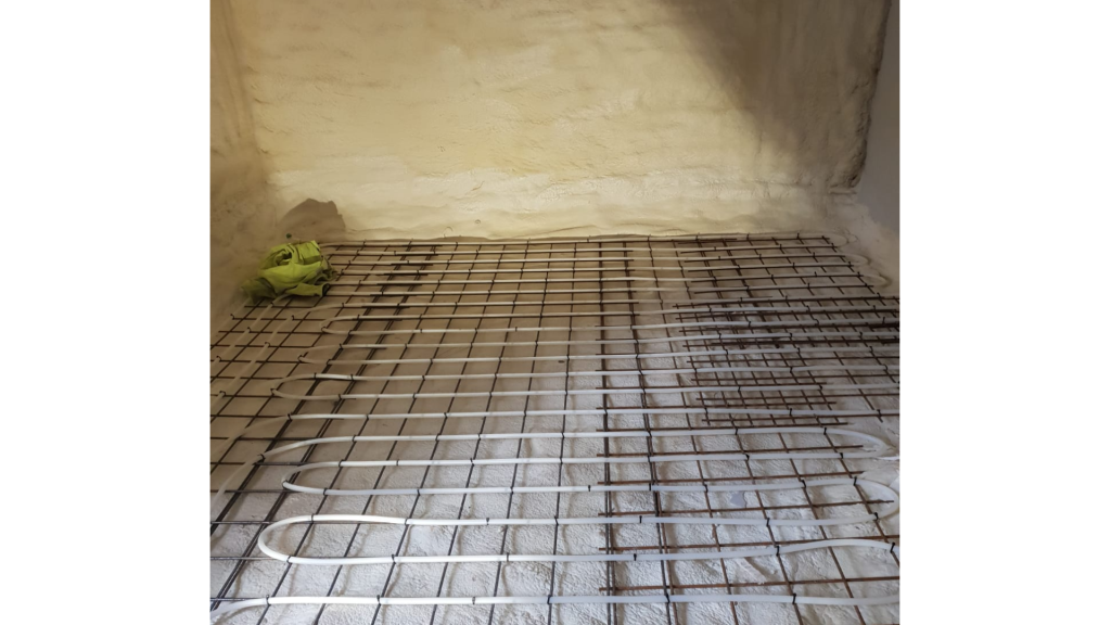Rintamamiestalon kellari remontoitiin asuinkäyttöön. Raudoitusverkkojen asennus lattiaan eristeen päälle ja vesikiertoisen lattialämmityksen putkitusten asennus.