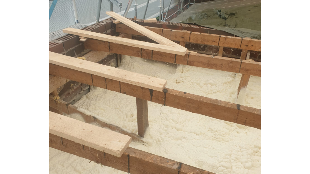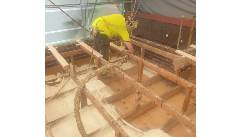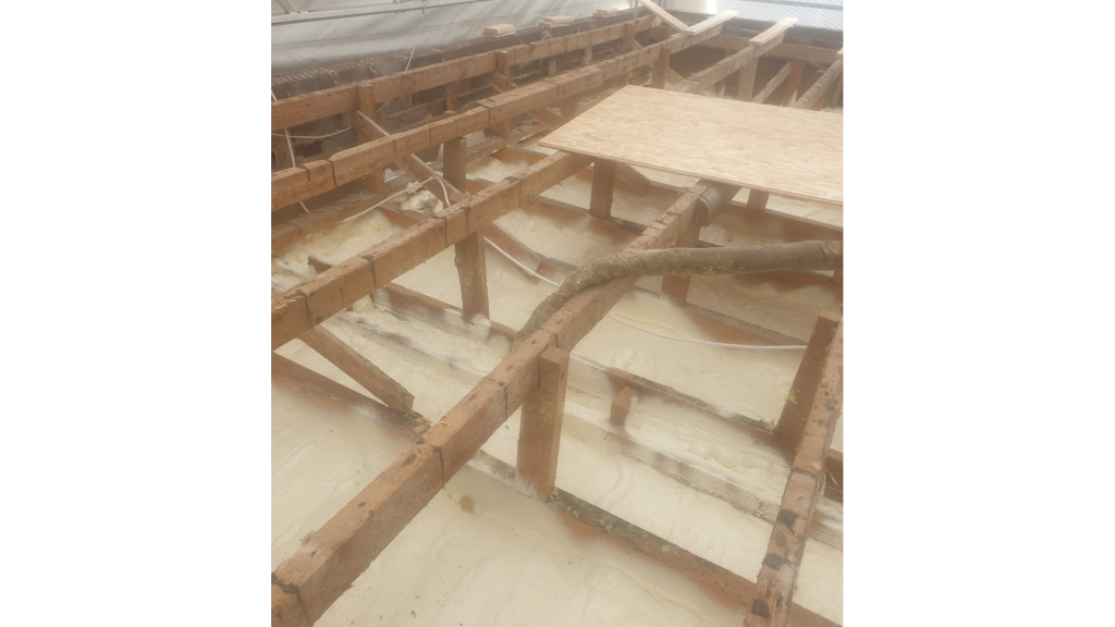 Uudenmaan Huopakatot tilasi meiltä eristyksen kattoremonttikohteeseensa. Kyseessä on tasakattoinen paritalo, jossa höyrysulku korjattiin suljetun solun uretaanilla ja sen päälle asennettiin vielä kerros avosoluista uretaania ääni- ja lisälämmöneristeeksi.