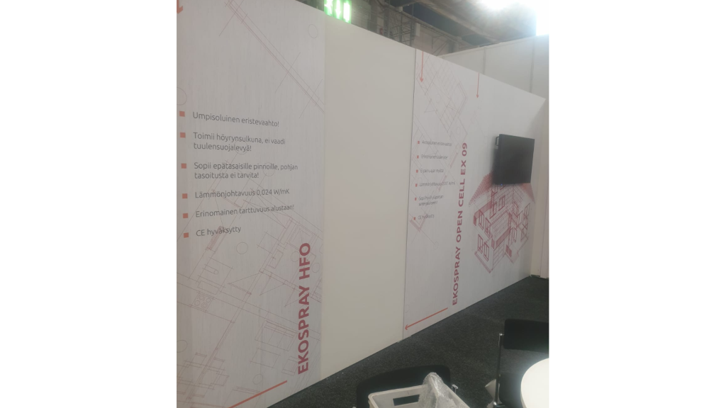 Toteutimme eristeseinät materiaalitoimittajamme messuosastolle.