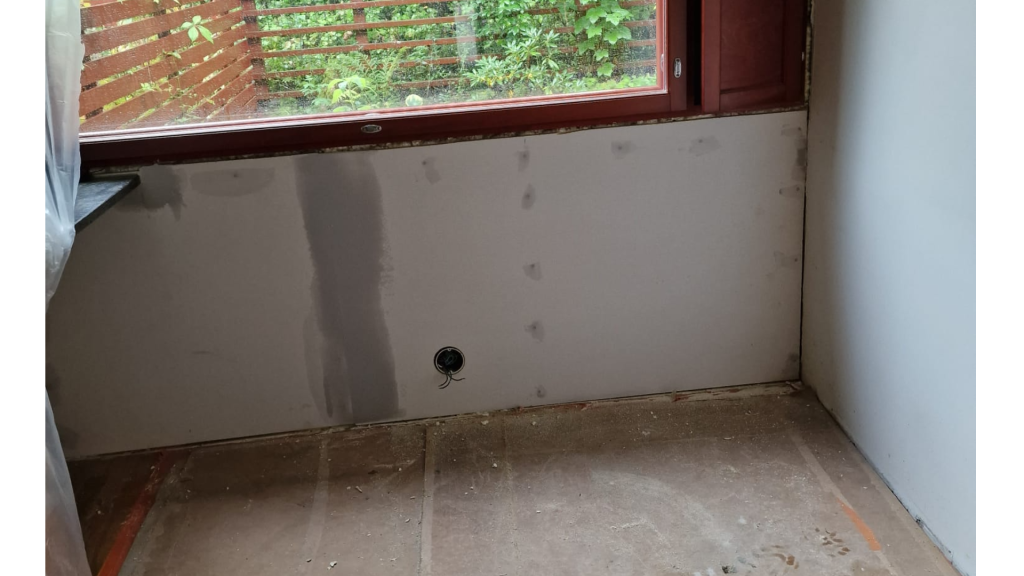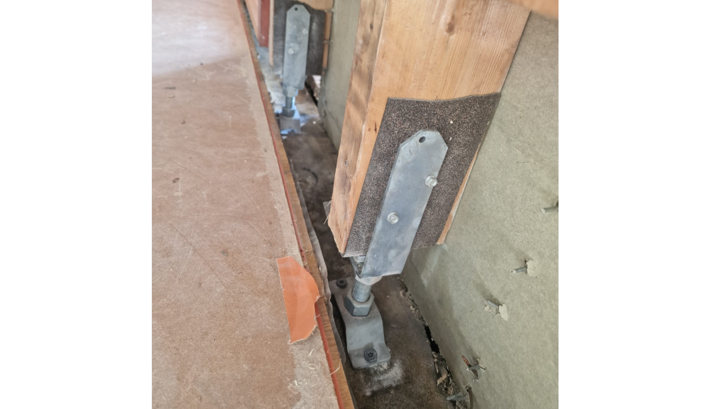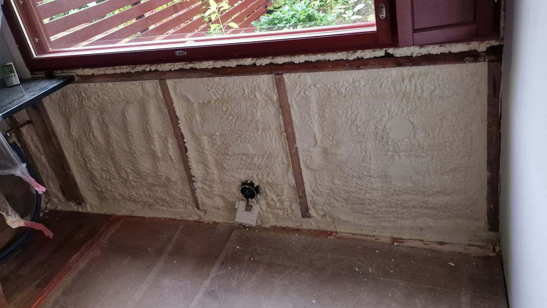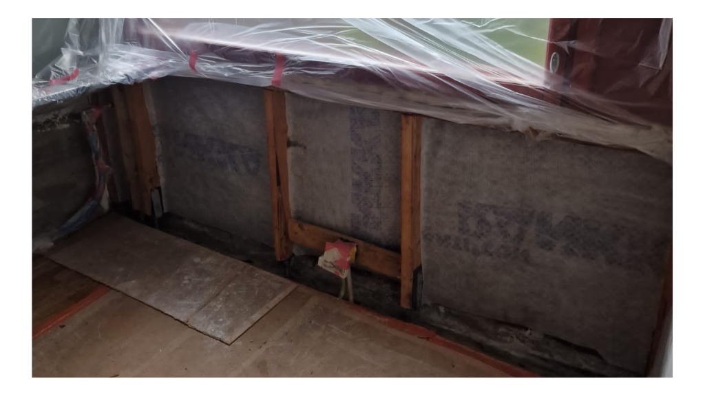 Seinistä poistettiin lastulevyt alhaalta ikkunoiden alapinnan tasoon. Vanhat eristeet sekä alaohjauspuu poistettiin, runkotolpat katkaistiin lattiapinnan tasoon/yläpuolelle. Valesokkelitila puhdistettiin. Jokainen runkotolppa jatkettiin terästassulla, puun ja metallin väliin asetettiin bituminen sokkelikaista. Valesokkelitila sekä seinärunko eristettiin kaasu- ja vesitiiviillä ruiskutettavalla uretaanilla (HeatLok HFO Pro, Huntsman Building Solutions). Eristetyt seinät levytettiin lastulevyllä, tasoitettiin ja maalattiin. "Remontti sujui sovituissa aikataulu puitteissa ja suurempia yllätyksiä ei kengityksen aikana ilmennyt, sekä saatiin kattava loppuraportti taloyhtiölle. Saatiin sovittua asiat hyvin ja sovituista asioista pidettiin kiinni." - Urakkamaailman asiakaspalaute