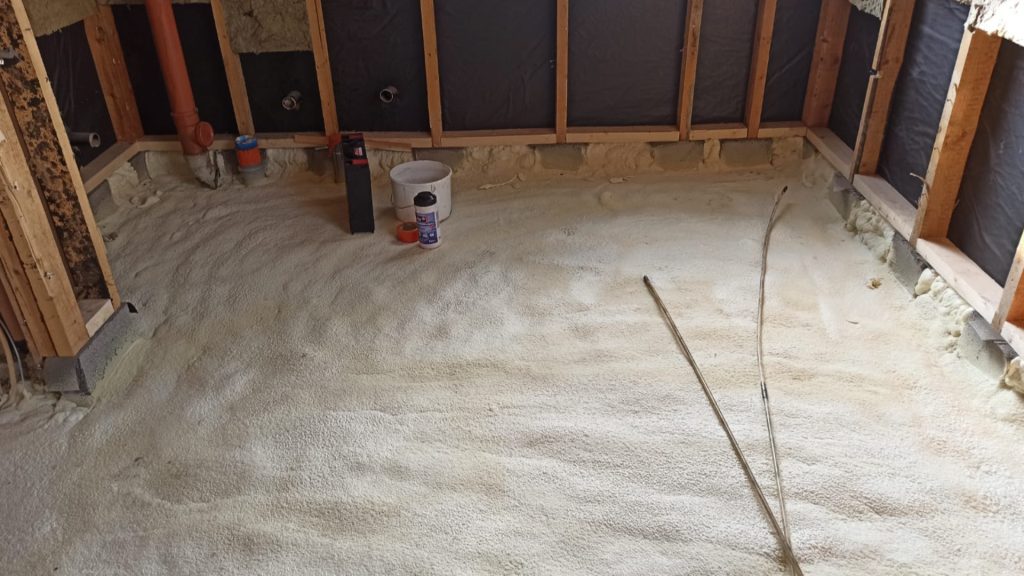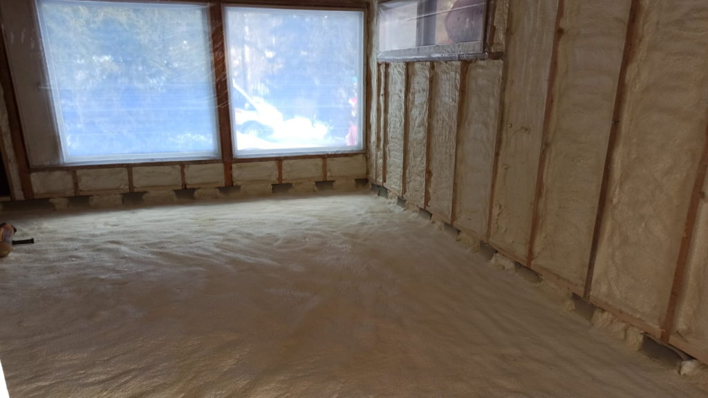 Maanvaraisen lattialaatan uretaanieristys kaasutiiviillä eristeellä, konsultointi valesokkelin kengitykseen sekä ulkoseinien eristys avoimen solun uretaanieristeellä.