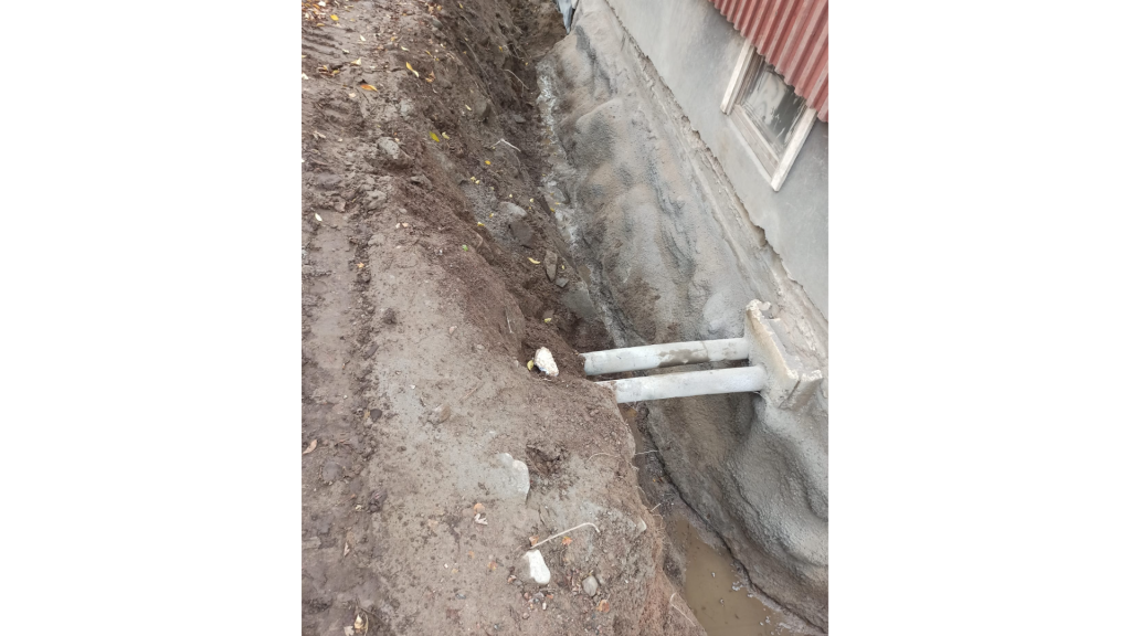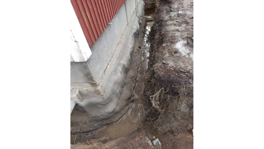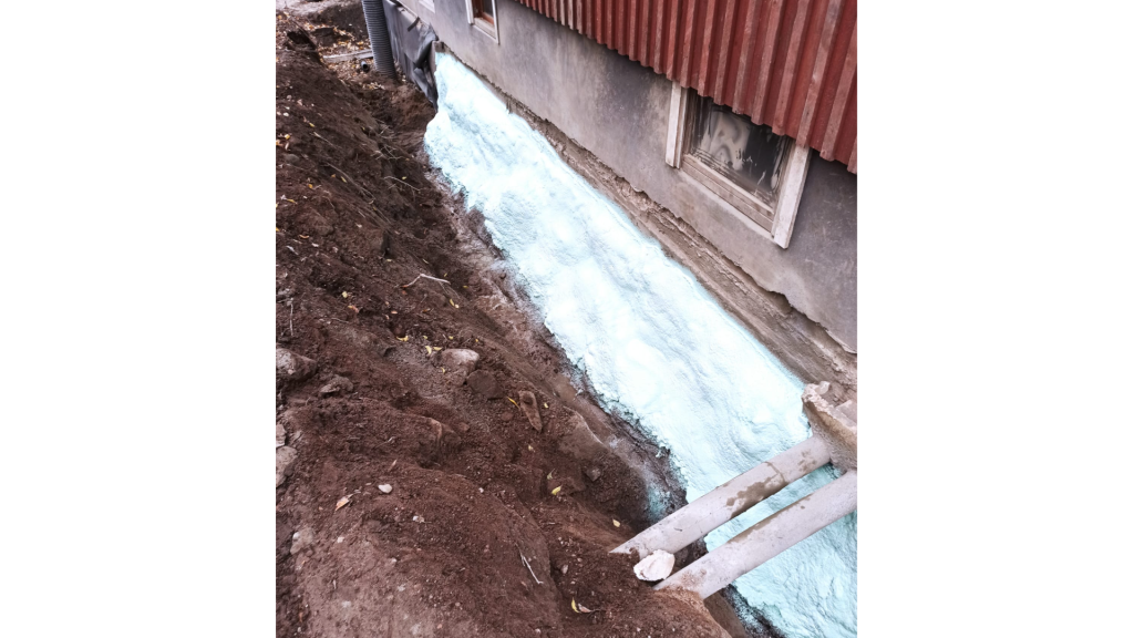 Kohteessa oli kaivettu esiin vanha halkeillut betonisokkeli. Se korjattiin betoniruiskutuksella, minkä jälkeen eristimme sokkelin kaasutiiviillä ruiskutettavalla uretaanilla. Eri muotoisten, myös epätasaisten, pintojen tiivis eristäminen on mahdollista ruiskuttamalla. Tässä kohteessa juuri tästä oli etua, koska sokkelissa oli runsaasti koloja ja ulkonemia. Levyeristeellä toteutus olisi ollut todella haasteellista.