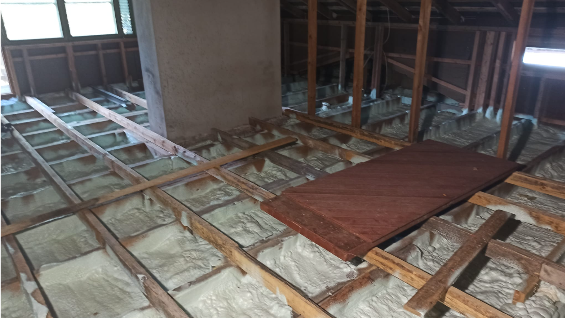 Asiakas halusi korjata höyrynsulun välipohjasta. Kohteessa oli myös massiivinen hiiriongelma. Vanhat eristeet olivat täysin jyrsijöiden pesiä täynnä. Asiakas oli poistanut eristeet, korjannut rakennevaurioita ja halusi jonkun huoltovapaan eristeen. Tähän tarkoitukseen käytettiin umpisoluista uretaania, se korjasi höyrynsulun Sen päälle laitettiin avoimen solun uretaania äänieristeeksi ja lisäeristeeksi. Toistaiseksi jyrsijät eivät ole palanneet eristeisiin asumaan. Eristettävää pinta-alaa oli n. 150 m2 ja työhön meni kaksi työpäivää.