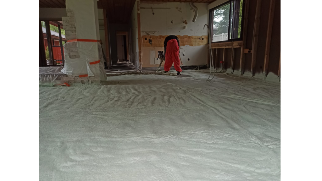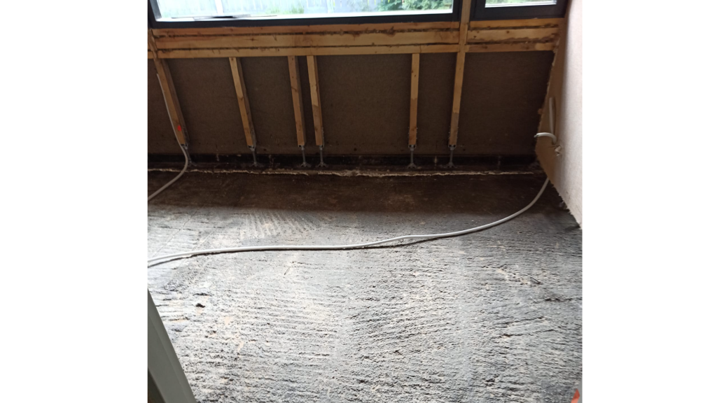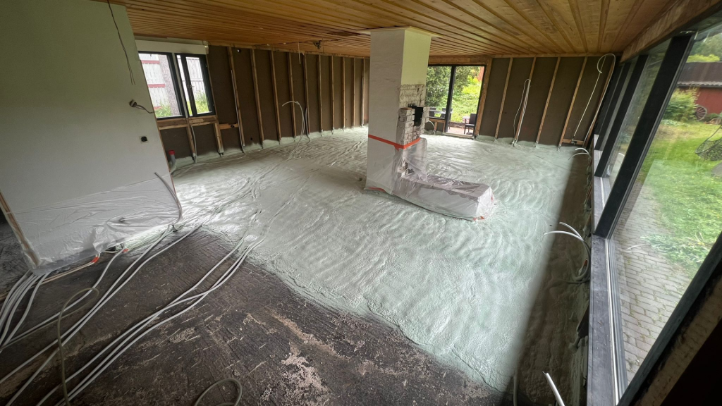 Kohteessa oli käynnissä massiivinen remontti, talotekniikka ja eristykset menivät pintojen ohella kokonaan uusiksi. Korjasimme nopealla aikataululla 70-lukulaisen omakotitalon valesokkelin Terästassuilla kengittämällä. Maanvarainen betonilaatta ja seinät eristettiin kaasutiiviillä uretaanilla.