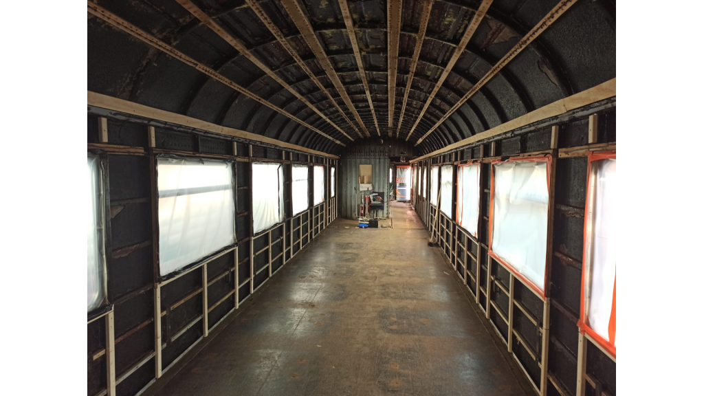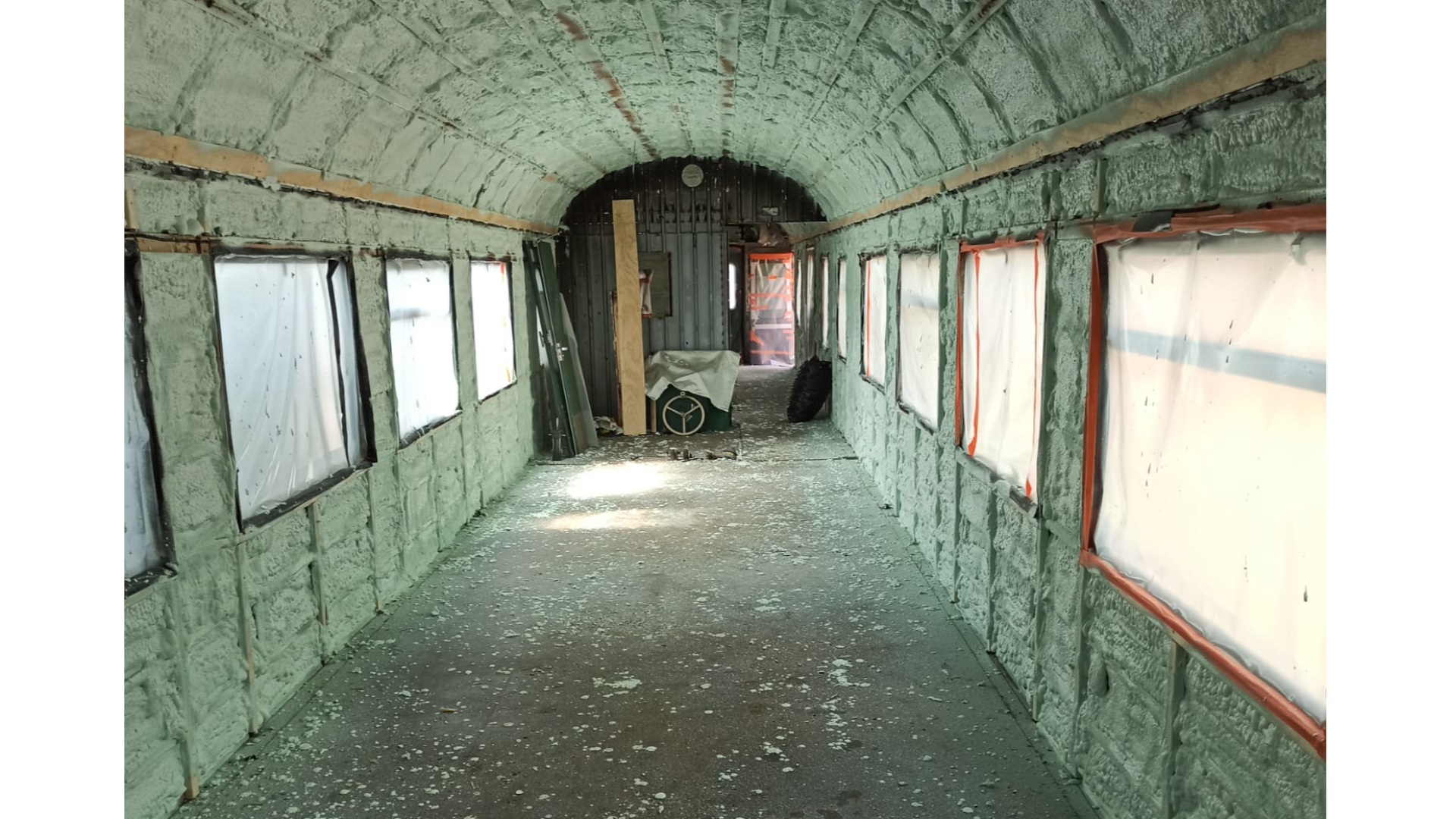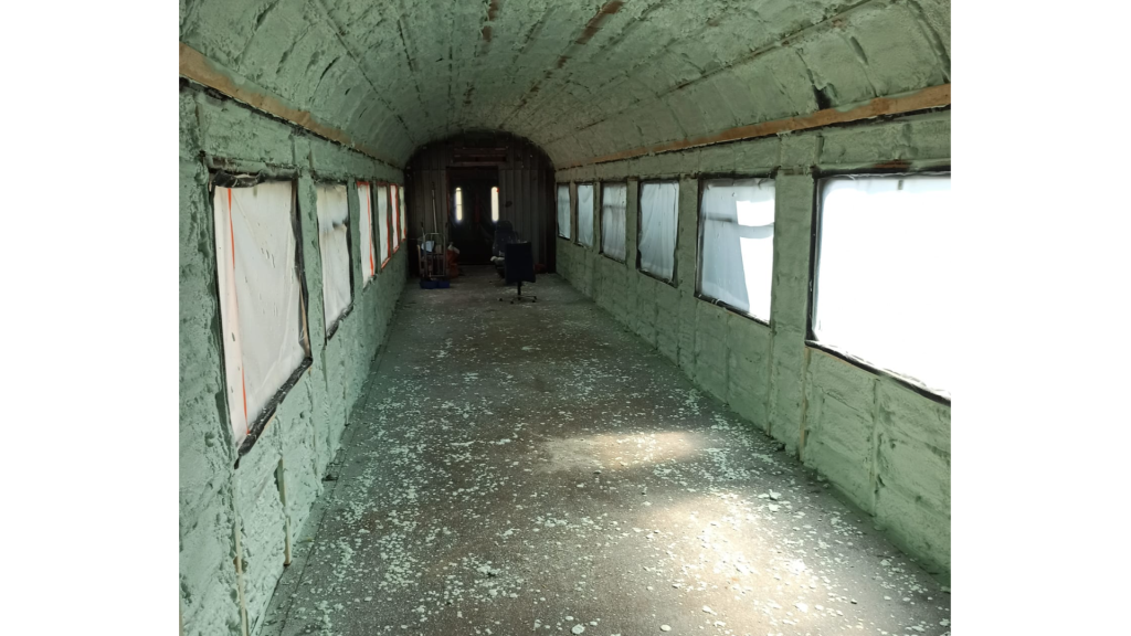 Pääurakoitsija Laatukumppani Oy oli purkanut vanhan junavaunun sisustan ja koolannut seinä- ja kattorakenteen sekä hoitanut suojaukset. Eristimme vaunun kaasutiiviillä uretaanilla. Kohde oli todella haastava toteuttaa, koska rakenteessa oli todella paljon pieniä koloja ja kapeita välejä.